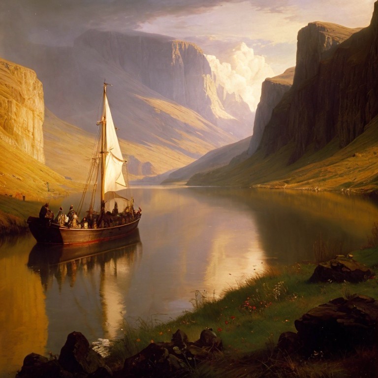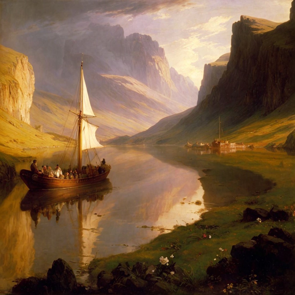 Serene Landscape with Boat on Calm Waters and Cliffs