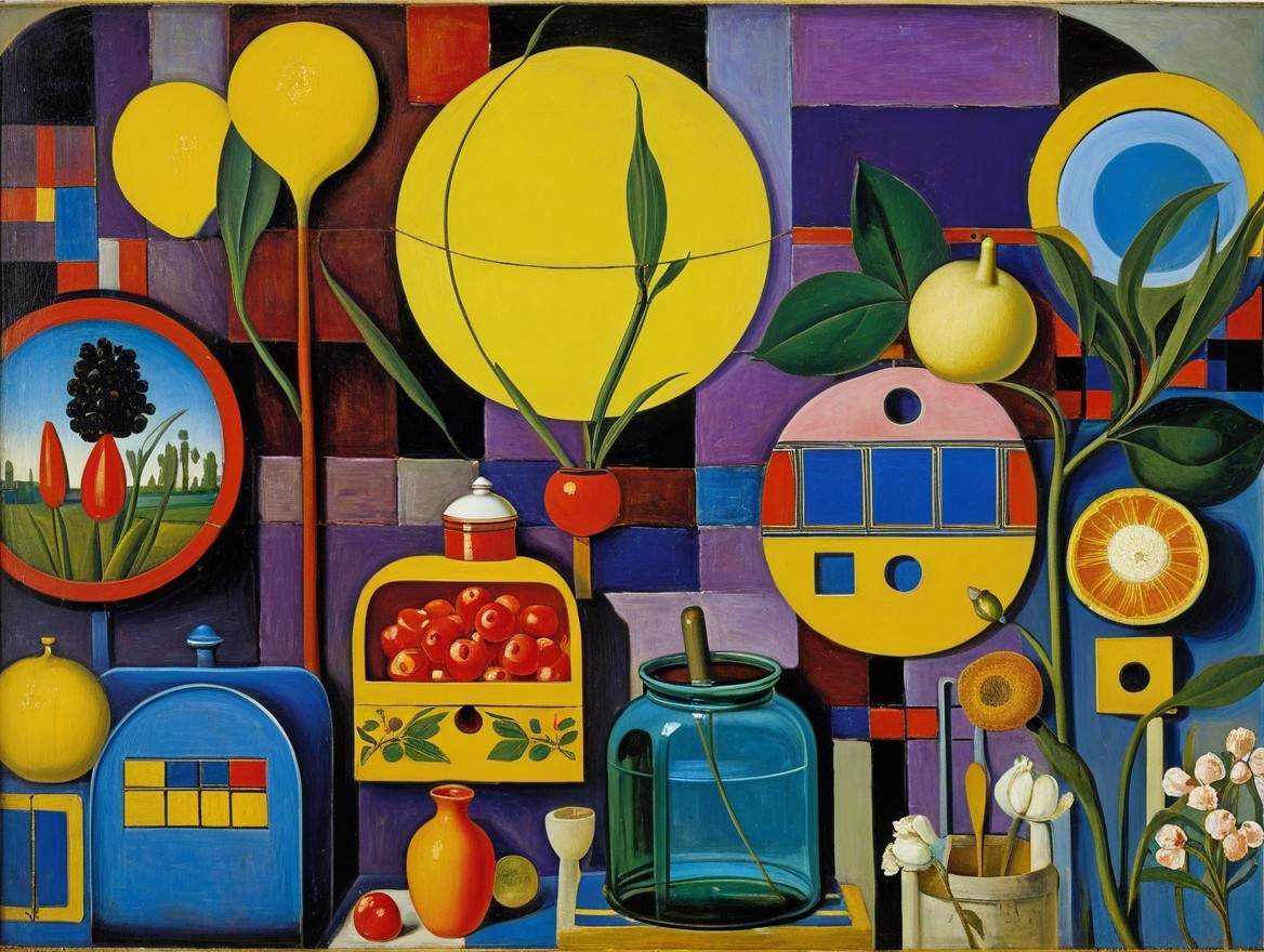 A vibrant still-life composition featuring bold, geometric arrangements of fruits, flowers, and objects. The scene radiates a playful energy, blending whimsical natural elements with structured abstraction. Bright primary colors and folk-inspired details create a captivating visual balance.