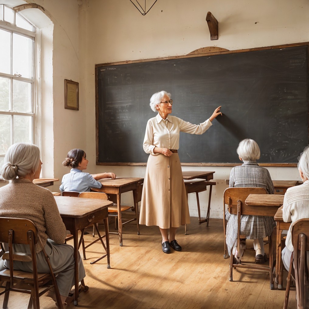 A teacher explains complex math on a blackboard to attentive adult students in a sunlit classroom.