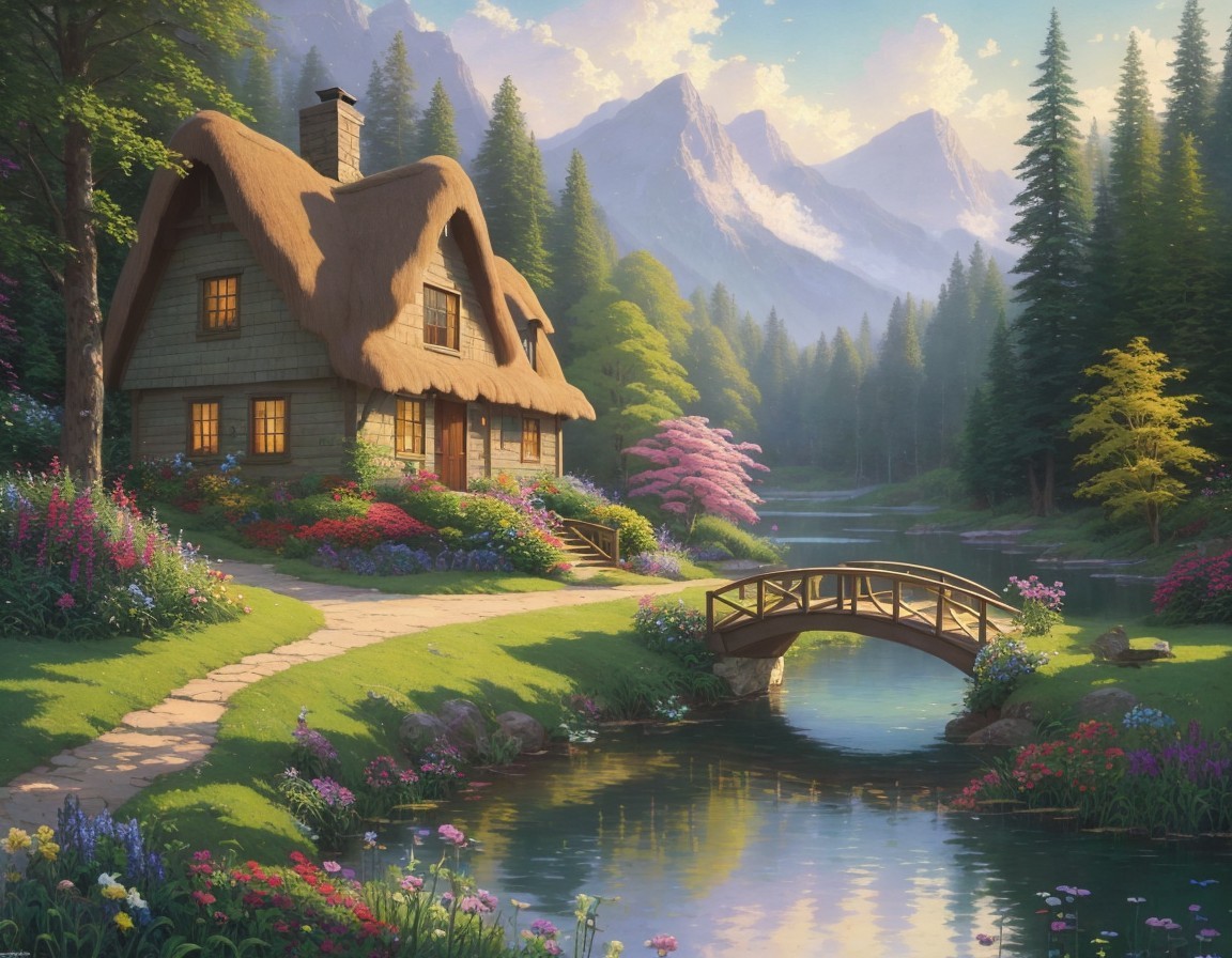 Prompt: "a cottage in a meadow with a lake and a bridge connecting the cottage to a forest in the style of Thomas Kinkade, Bob Ross art inspired by Maxfield Parrish, high definition, soft strokes, pretty flowers, lush vegetation."