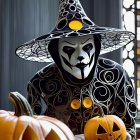 A mysterious figure in a black cloak and ornate mask holds a carved pumpkin with a mischievous grin. The backdrop features a medieval-style setting, enhancing the eerie Halloween atmosphere.