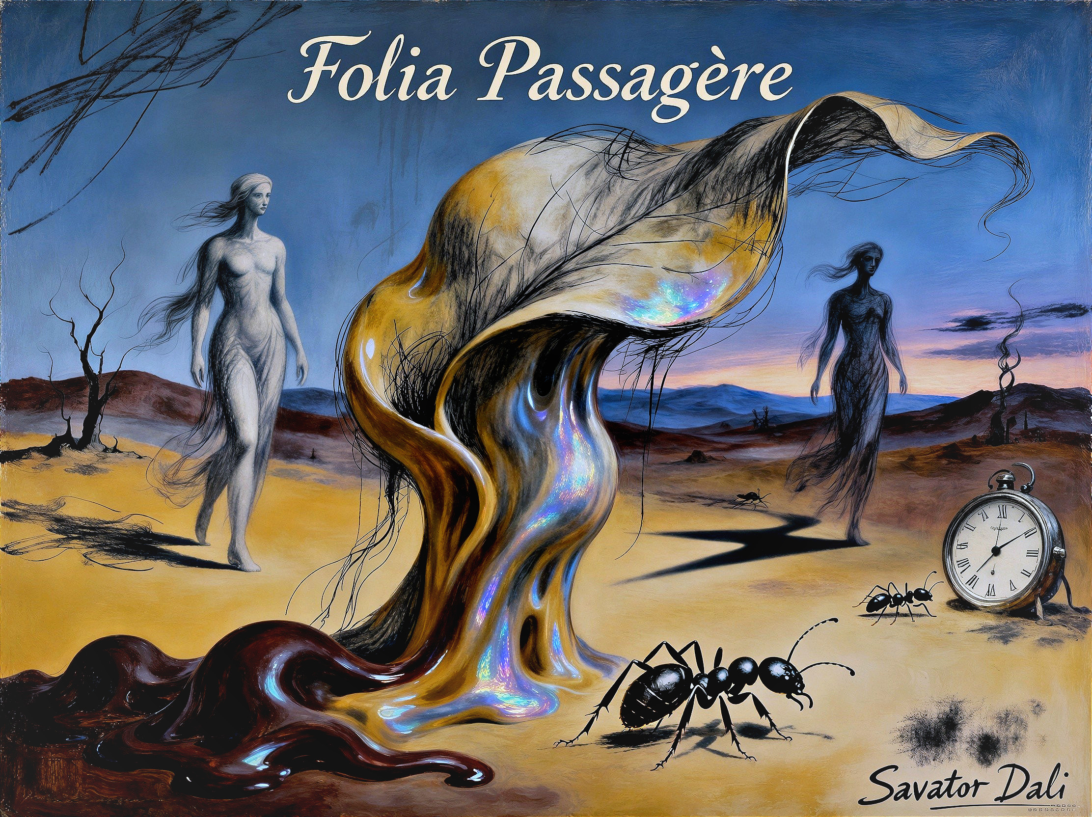 A surrealist Dali painting titled "Folia Passagere" depicts an abstract landscape with two ethereal figures, a grand iridescent leaf structure, a melting clock, and several ants. The background is a gradient sky from deep blue to lavender and orange, with distant dark mountains. The foreground is a sandy