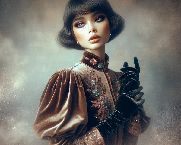 A regal figure adorned in intricate gold jewelry and a flowing white gown, illuminated by a glowing lantern. She stands against a starry background, exuding elegance and mystery.