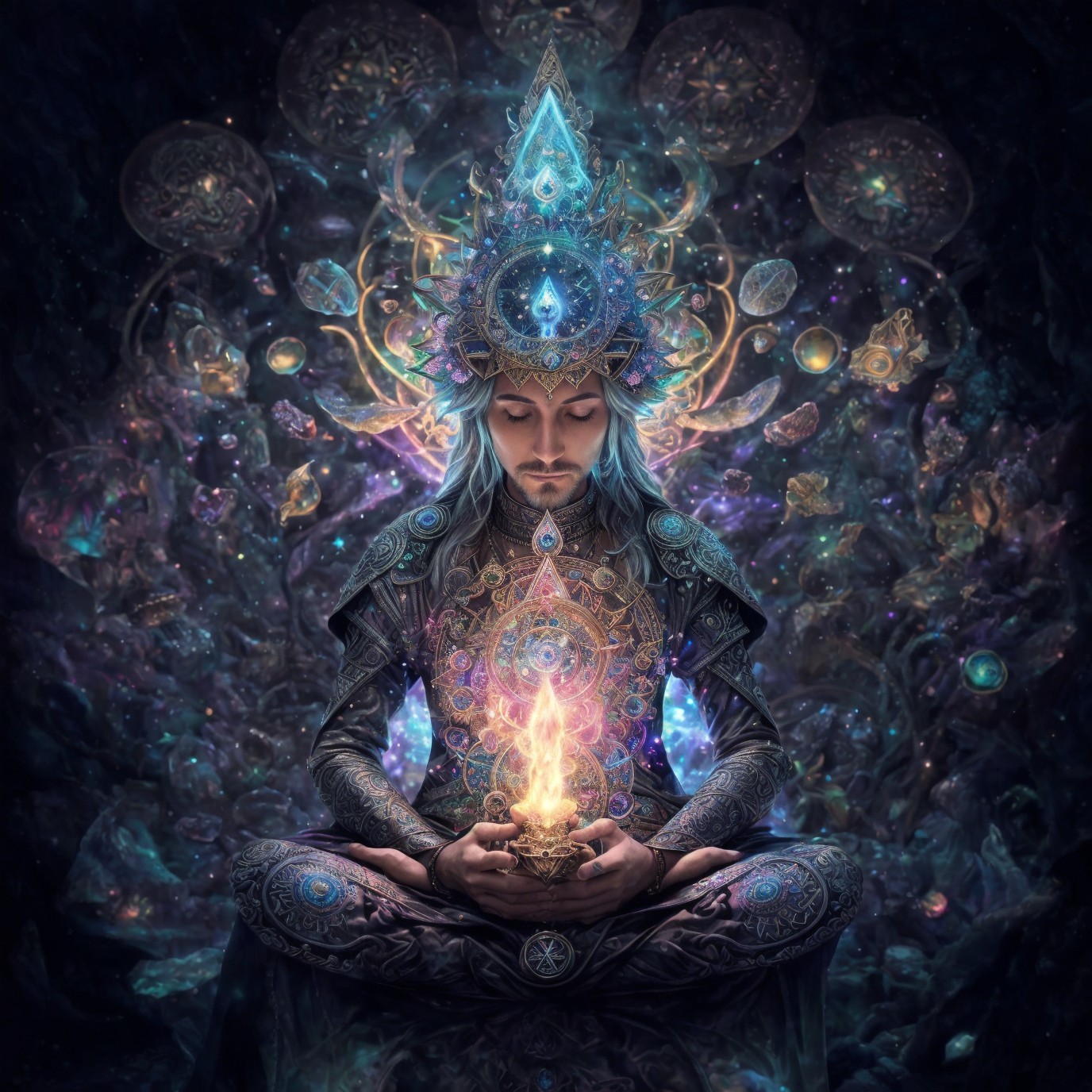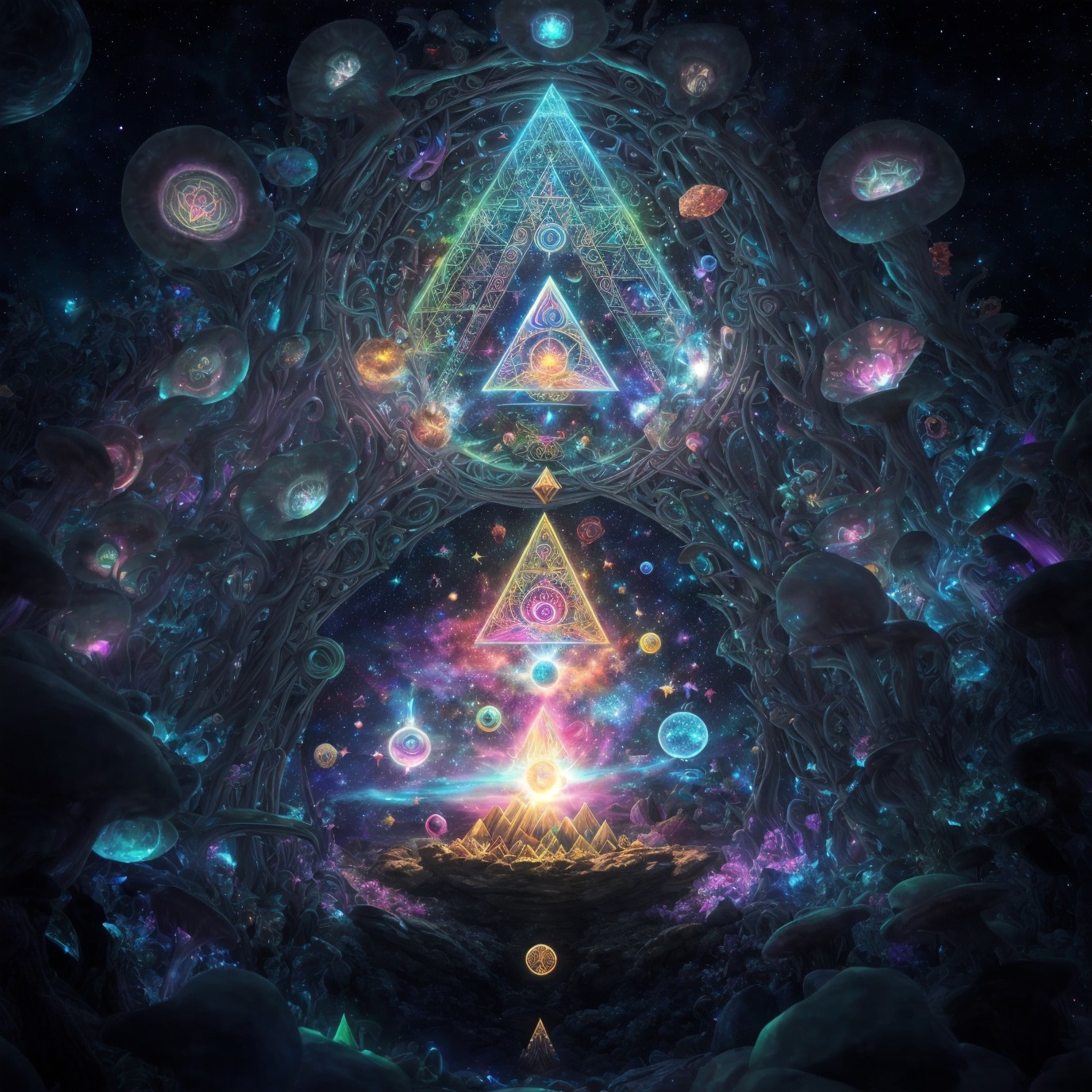 A mystical forest scene with glowing, magical symbols, celestial backdrop, and an otherworldly portal within towering trees.