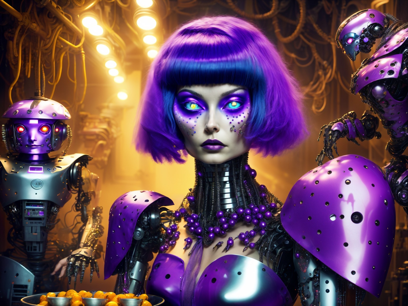 A futuristic scene features a young woman with vibrant purple hair and glowing eyes, surrounded by robotic figures. She holds a tray of orange spheres, set against a backdrop of colorful clouds.