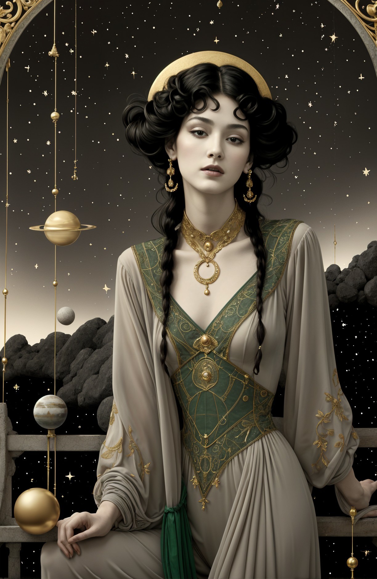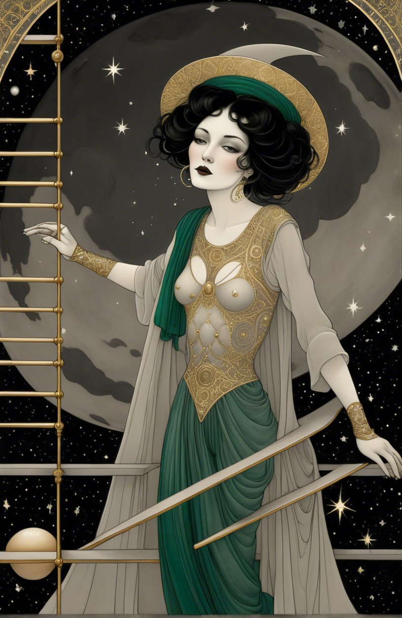 A stylized woman climbs a ladder towards celestial bodies in a star-filled, Art Nouveau-inspired scene.