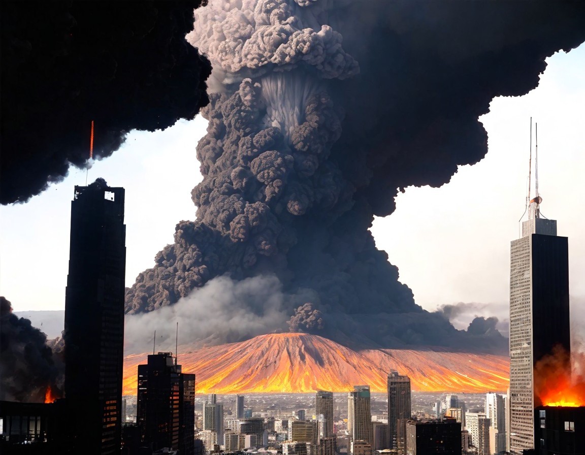 Volcanic Eruption Over Cityscape with Dark Clouds