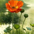 Prompt: The artwork presents a close-up abstract portrait centered on a red Poppy, characterized by layered textures and fragmented elements, harmonizing iridescent color tones. The composition incorporates a distressed background with vertical streaks and metallic accents, evoking an industrial aesthetic and enhancing depth and contrast. This piece establishes a mysterious and evocative atmosphere, skillfully blending modern abstract art with zen art.
