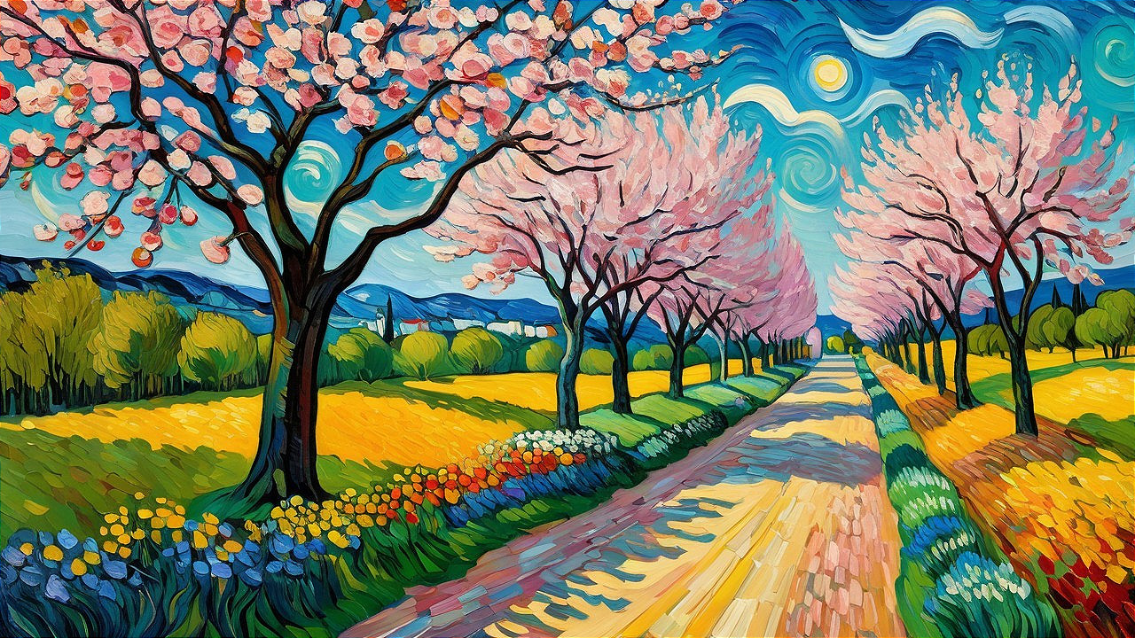 A vibrant landscape featuring blossoming cherry trees lining a winding path. Fields of bright flowers bloom under a swirling blue sky, creating a lively, impressionistic spring scene.