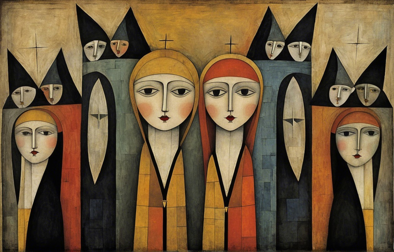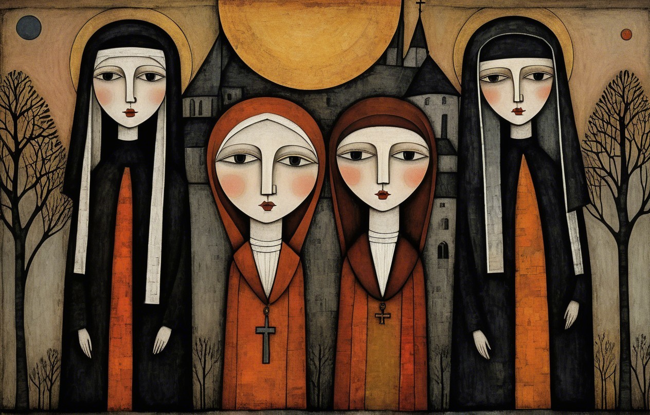 The image features four stylized women in religious attire, each with distinct expressions and holding staffs. The background depicts a serene landscape with churches and a golden sun.