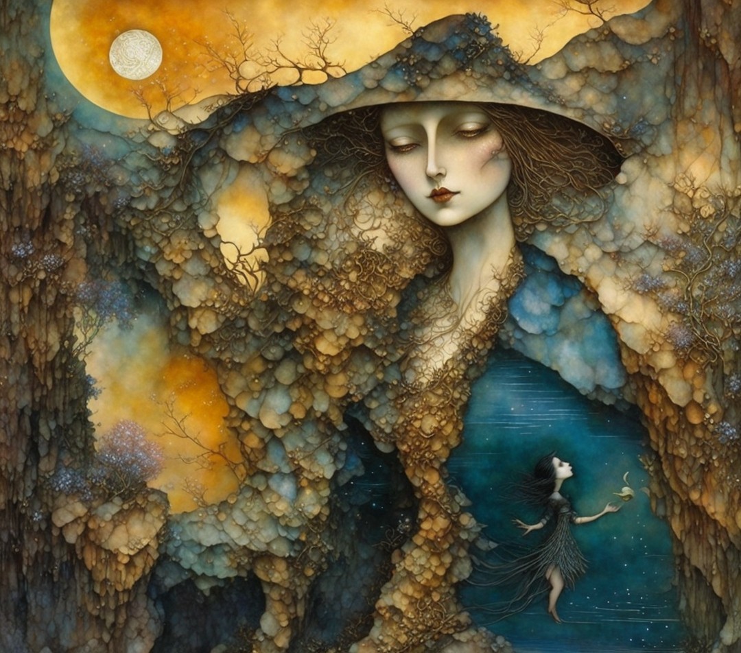 A serene woman with floral adornments and a sheer wing, stands before a majestic cliffside under an amber sky.