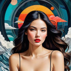A captivating fantasy portrait featuring a young woman with long black hair and delicate wings. She wears a red hat, and skeletal figures creatively intertwine with her, adding an eerie allure.