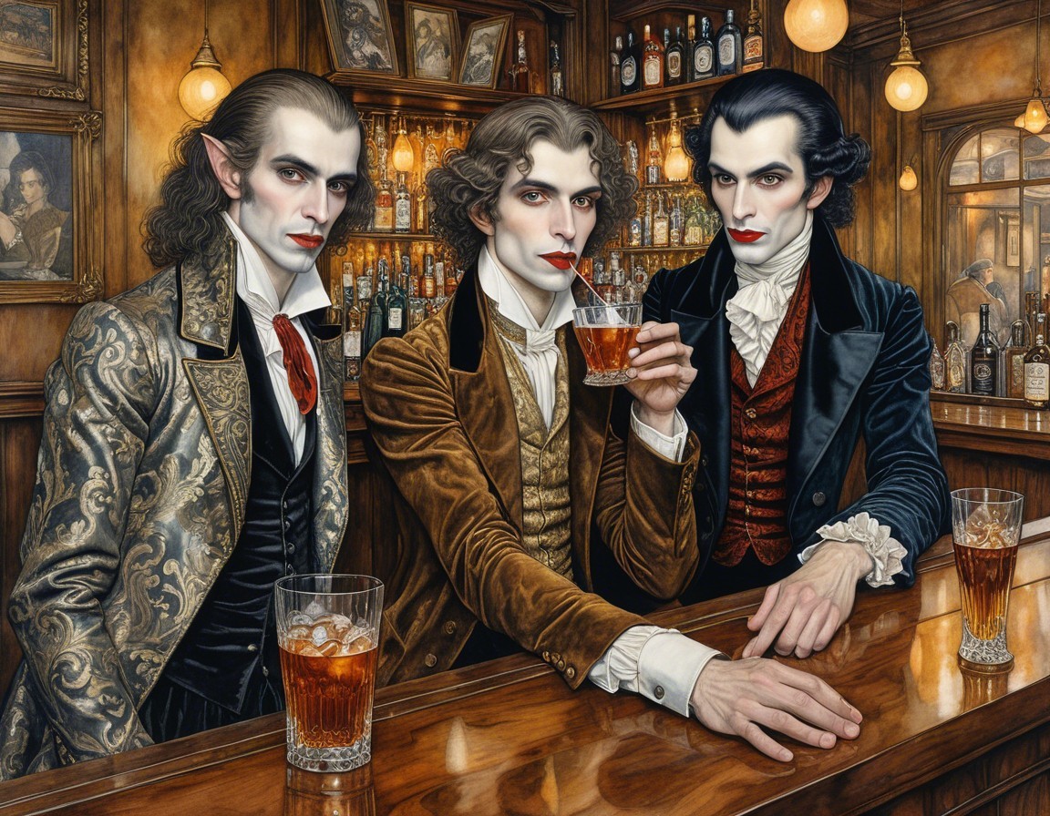 Two elegantly dressed men with striking white makeup and red accents sit at a wooden bar, sipping drinks. The rich, vintage interior adds to the atmosphere of a sophisticated night out.