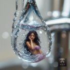The image depicts a beautiful figure with flowing hair, emerging from a shimmering water-like orb. It captures a serene, dreamlike quality, blending elegance with a magical atmosphere.