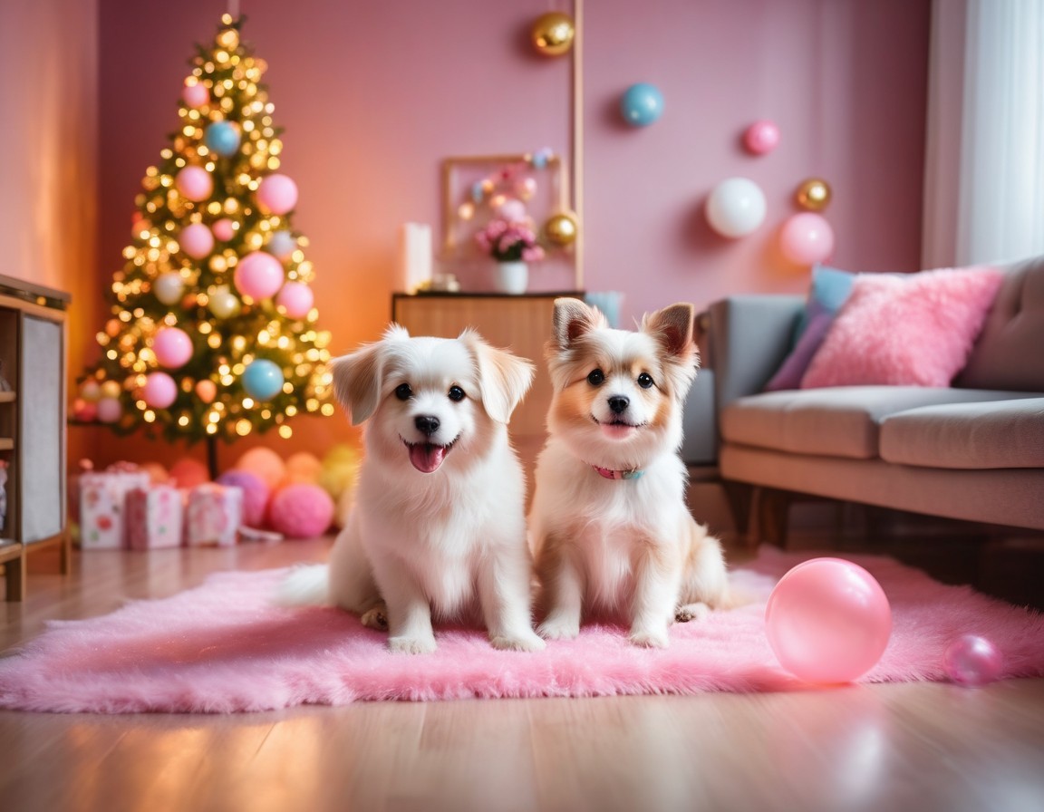 Two fluffy dogs lie on a pink rug with pink balls, a decorated Christmas tree in the background, in a cozy room.