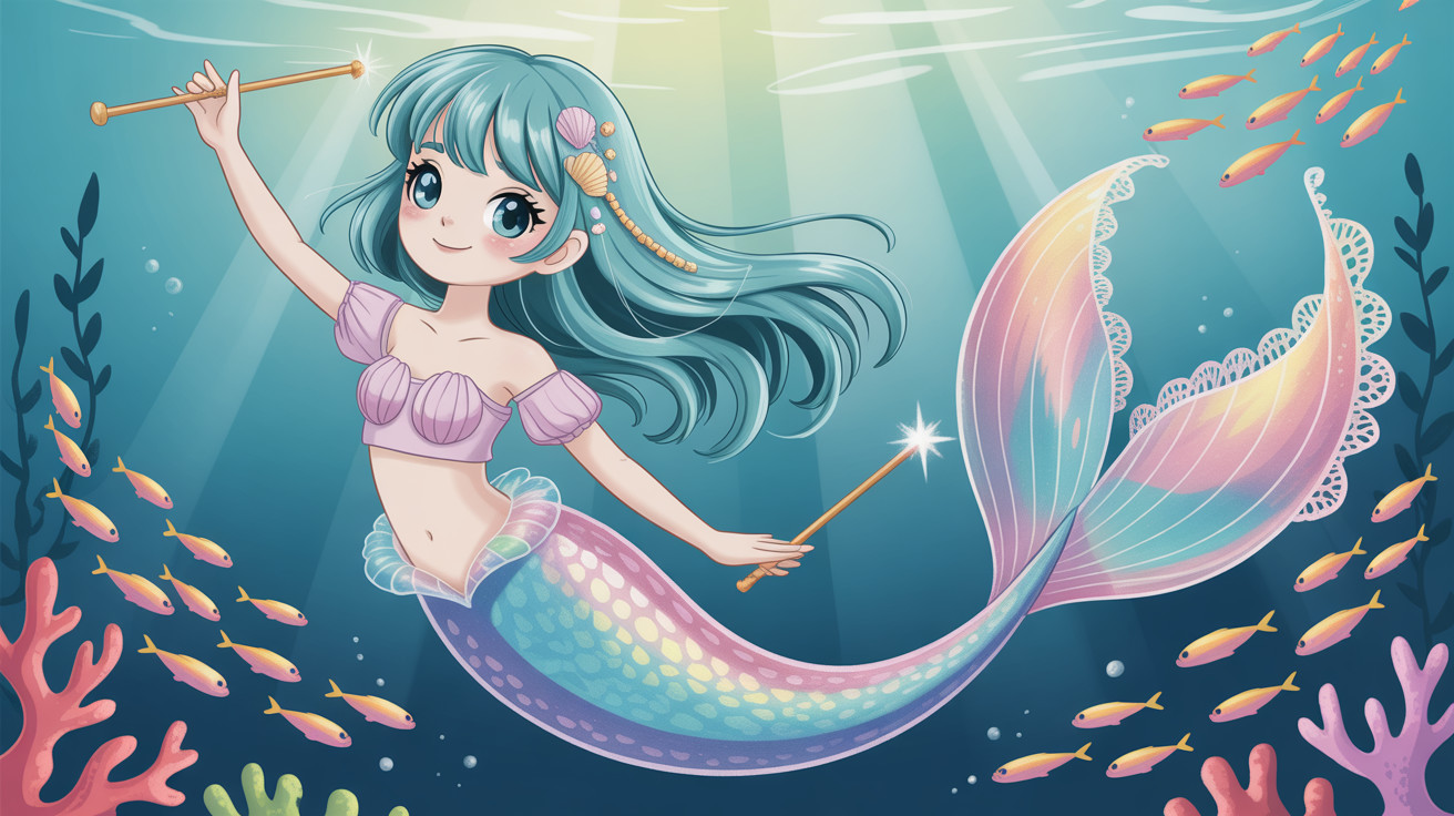 A whimsical character blends the charm of a mermaid with the skill of a baton twirler. With vibrant colors and flowing hair, she gracefully twirls her baton, captivating all with her enchanting movements.