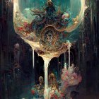 A stunning piece of abstract art featuring a teal droplet shape, surrounded by golden accents, lush foliage, and dripping textures, creating an enchanting interplay of color and form.