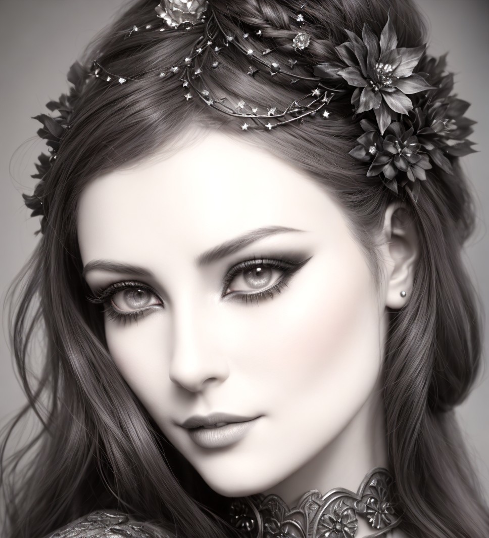 Detailed gothic elements, smooth dewy complexion, Other-worldly beauty & mystique