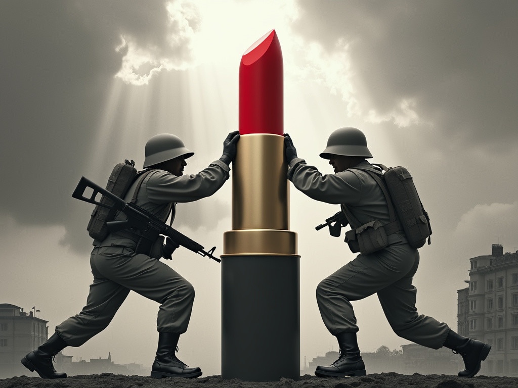 Prompt: "A surreal and satirical artwork featuring three soldiers in grayscale battle uniforms and caps, locked in a fierce struggle over an enormous, vibrant red lipstick. The soldiers are positioned centrally, with two on the left and one on the right, each grasping the lipstick. The lipstick stands upright, displaying its reflective metallic gold base. One soldier gazes forward, another leans in, and the third bends over, all exhibiting dynamic poses. Their rifles are slung over their shoulders, creating a striking contrast with the lipstick's intense color. The background portrays a monochromatic landscape with buildings and clouds, rendered in various shades of gray. Dramatic lighting and rays of light breaking through the clouds add depth and a dreamlike quality to the scene. The overall mood is surreal and satirical, with the high contrast between the, 3d render, illustration, poster, photo, product"