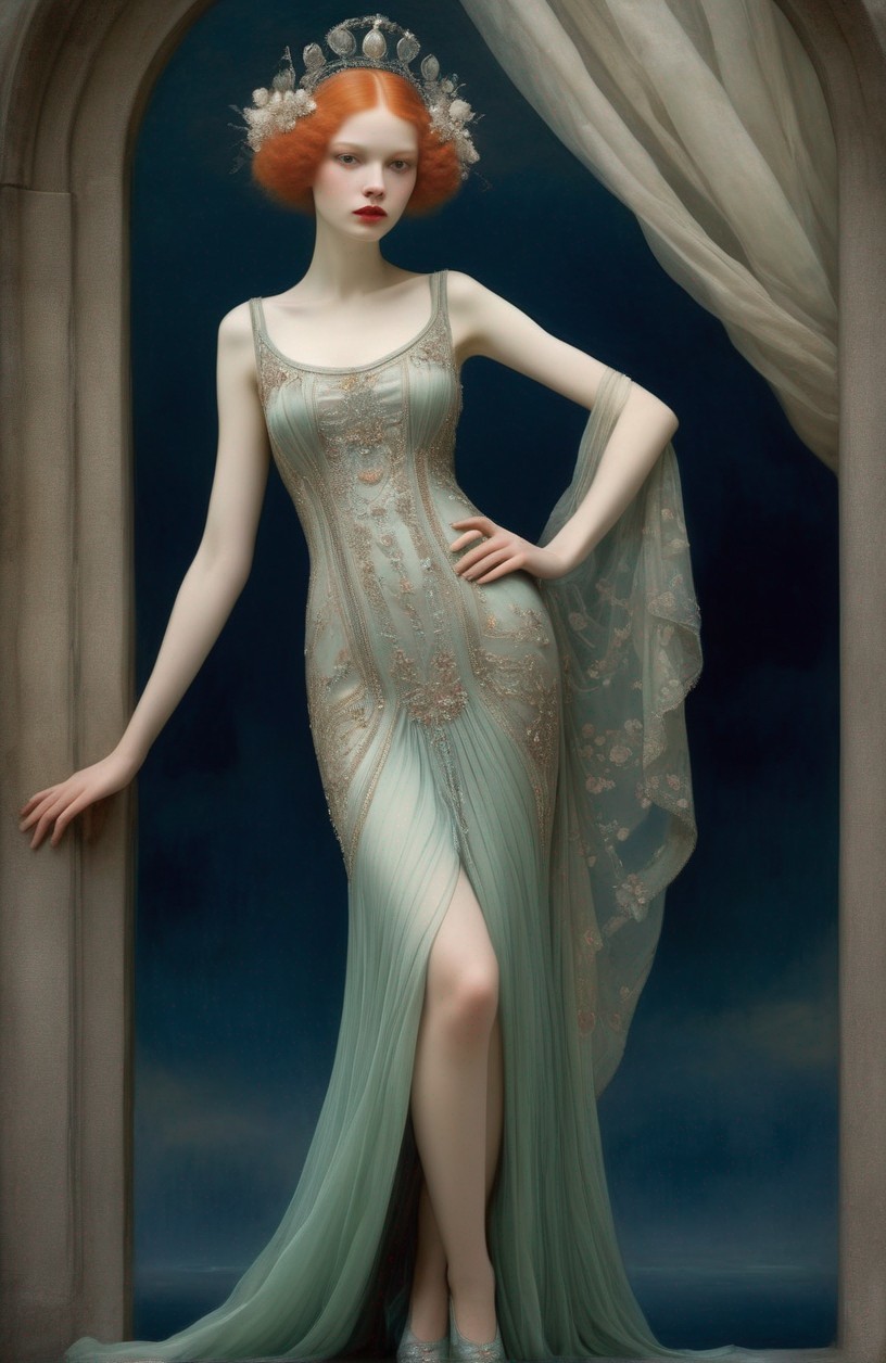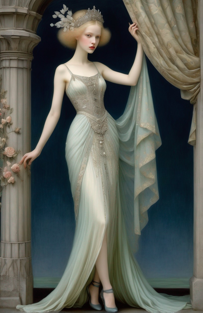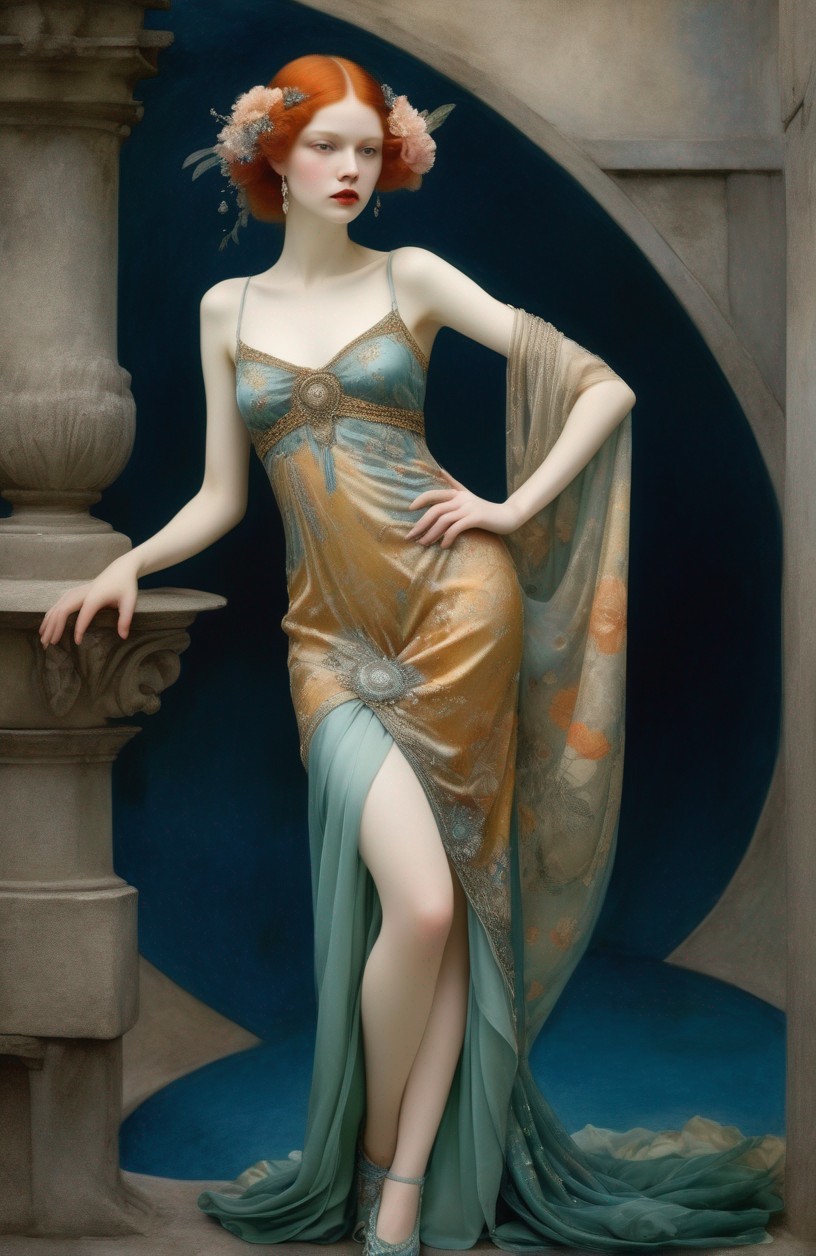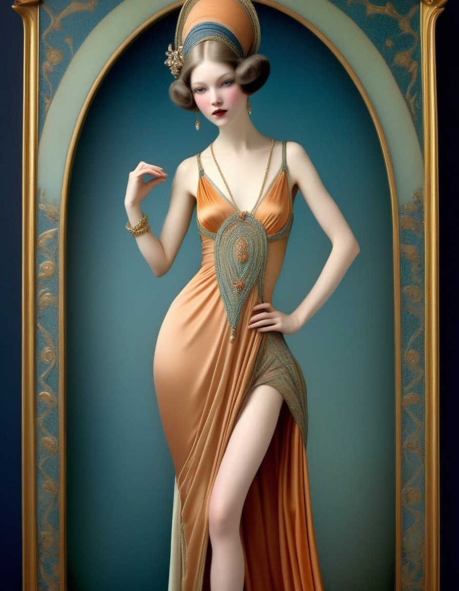 Woman with Pale Bob Hairstyle in Peach Evening Gown Beside Ornate Mirror
