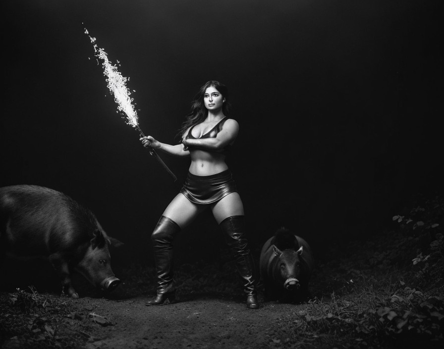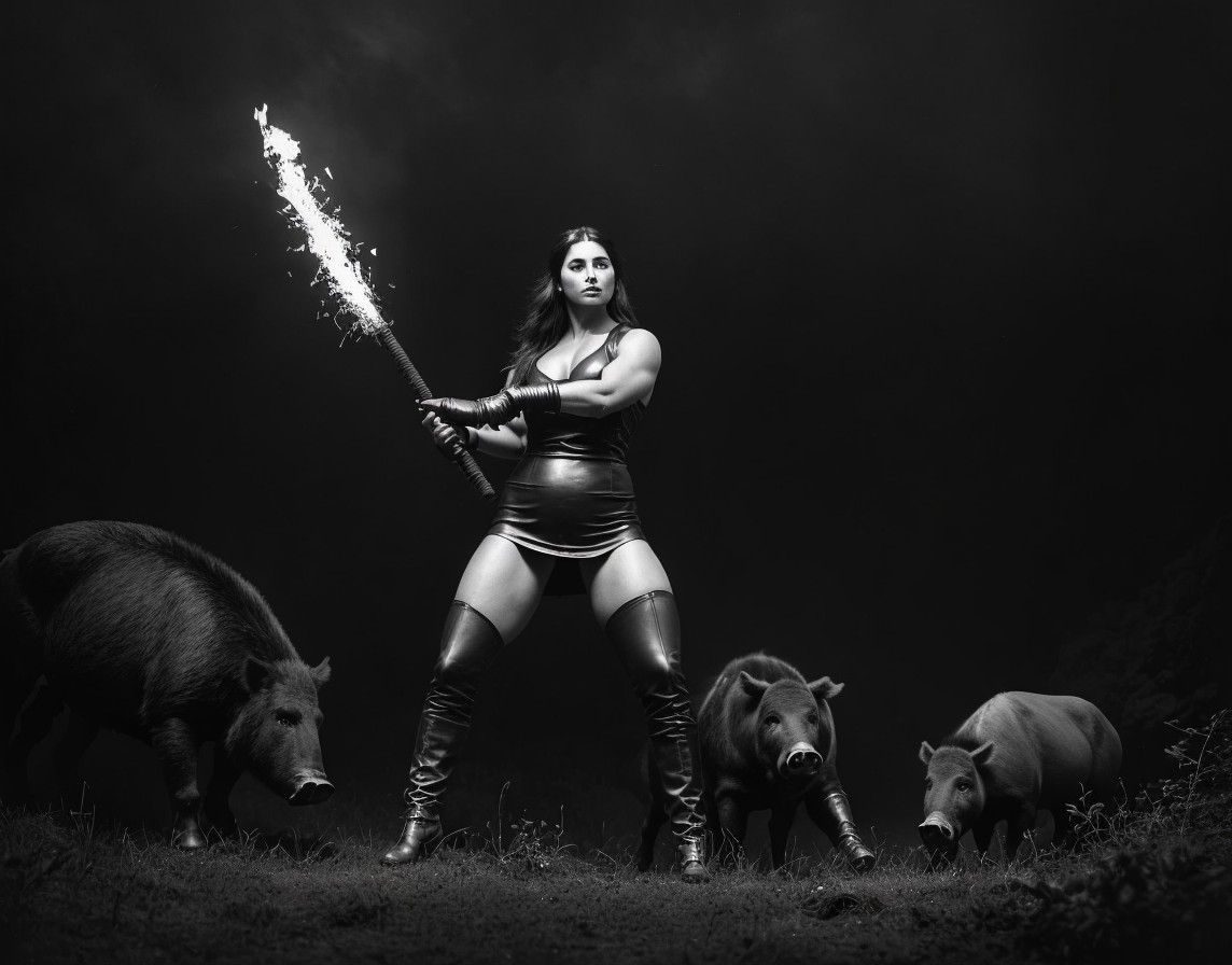 Prompt: Strong girl fighting a boar over a fire in a forest in the 19th century by Frank Frazetta + Gregory Colbert + Luis Royo,wearing a leather dress, down in a deep dark mine, a fusion of strength and grace, shadow as a coal miner in the backdrop, captured in sepia tone, chubby muscular frame, textures of leather and delicate fabric contrasting, soft focus, warm natural light, high contrast, ultra realistic, intense light, catchlight, chiaroscuro.