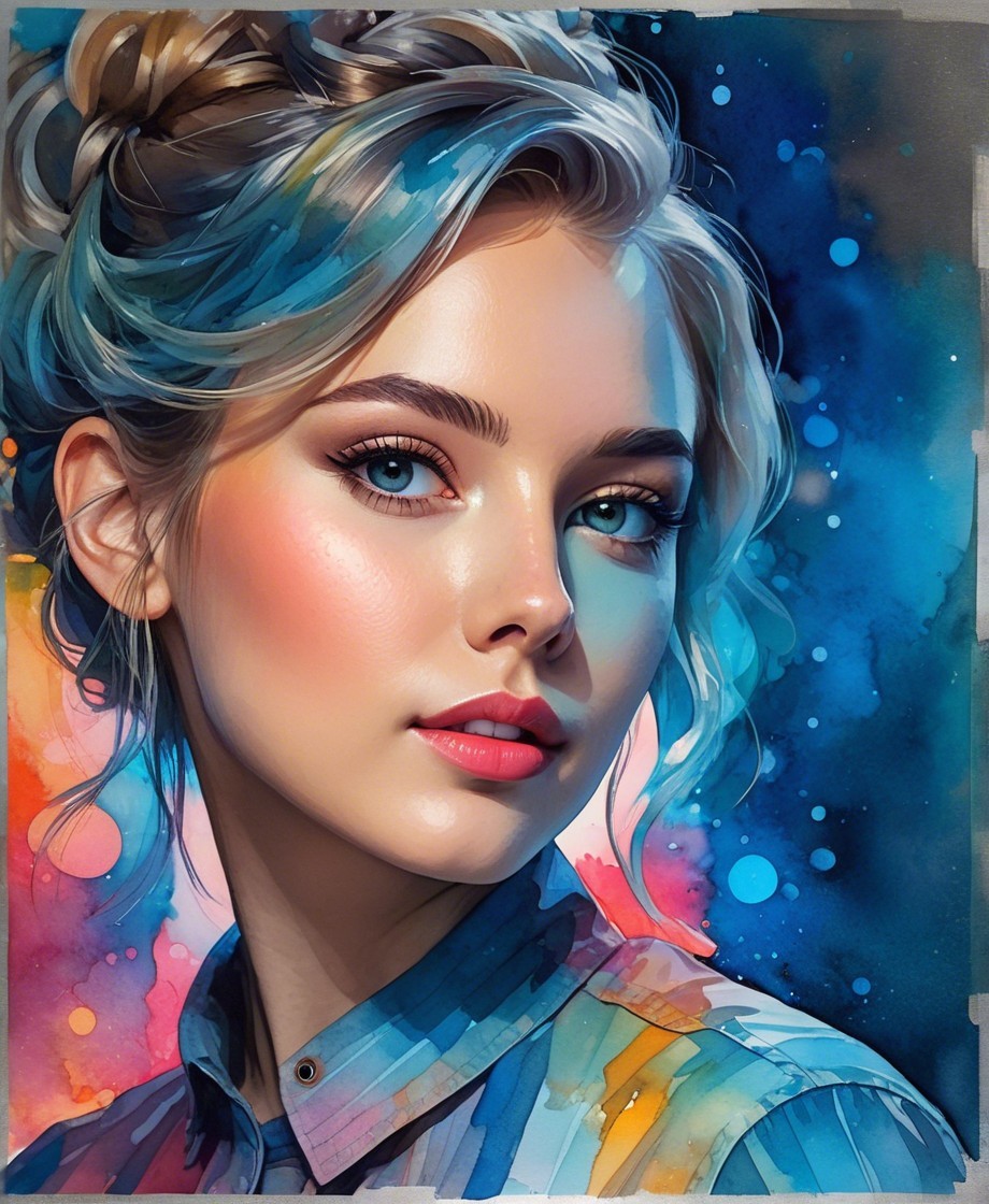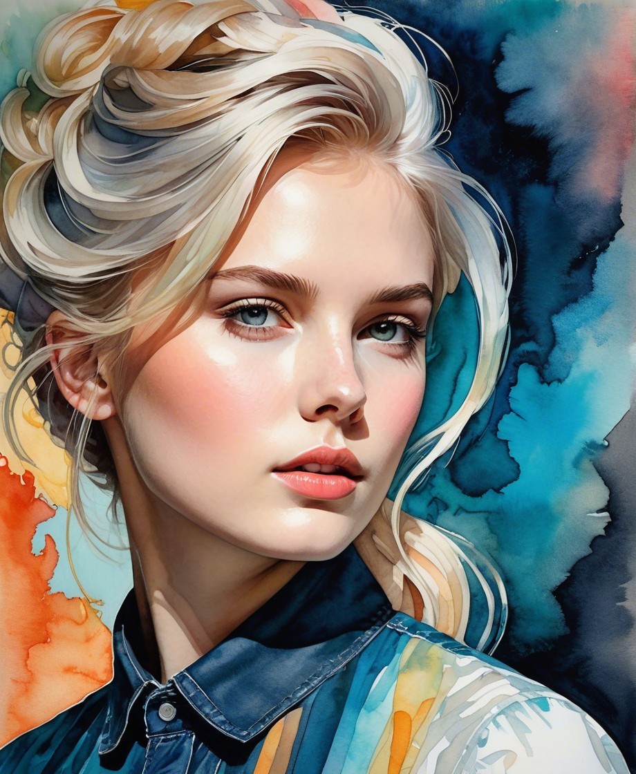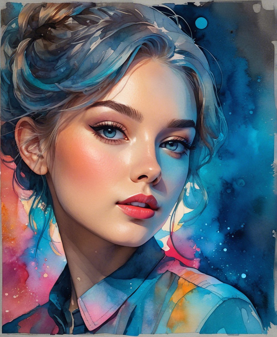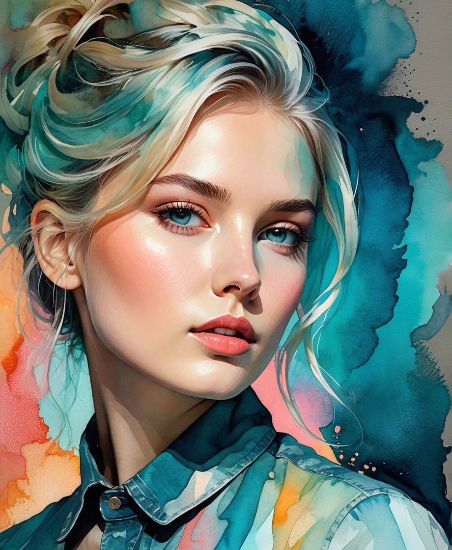Portrait, stylized collagraphy, great depth and scale, tousled light hair, bright splashing watercolors, merged styles of Overton Loyd and Man Ray, portrait with inking outlines, contrast coloring with intricate light and dark shapes, color shapes, layers of fabric that blend with turbulent flares, liminal, luminism, plasticity 1.6, orphism reference, pastel tones of white, cream, aqua, pink, and emerald green, rendered in a detailed watercolor painting style, emphasizing impasto, craquelure textures, and volumetric brush strokes in earth tones, creating a tranquil ambiance. focus on intricate details and a soft, ethereal coloring, novelty architecture, dof, bokeh, debeh, subsurface scattering 1.2, contoured, warm starfleet-blue, rosewood pink, dark red, light-yellow, light-ochre and beige tones, gradients, comic book art merged with cubistic-inspired orphism, swirling patterns, catenaries, dynamic lighting 1.5, geometrical line-art, warm red gradients, warm complex hues, catenaries, linework, abstract geometric designs, joyous atmosphere, luminous glow, geometrical composition, indiecore vibes, warm tones, complex interplay of light and shadow, diffused light, raytraced shadows 1.6, color shapes in background, natural, delicate tones for indiecore style, stylized hues by Ed Binkley, rough paint accentuating her features, color palette of light-yellow light-green light-red, harsh, abstract, smeary, brightness 1.4, linocut reference, anthotype print, thick textured layers, tactile feel, simplistic features, intricate warm coloring, fantasy ambiance. vivid coloring, close-up, detailed skin textures, complexion 1.3, slightly sculpted, flowing hair illusion, dethereal atmosphere, detailed artistic illustration, vibrant and rich colors, digital artwork with artistic flair. intricate alcohol ink effects, whimsical oversprays of color. Embrace a stylized, stippled look with tesselated patterns, overall composition by Freda People and Vincent DiFate,