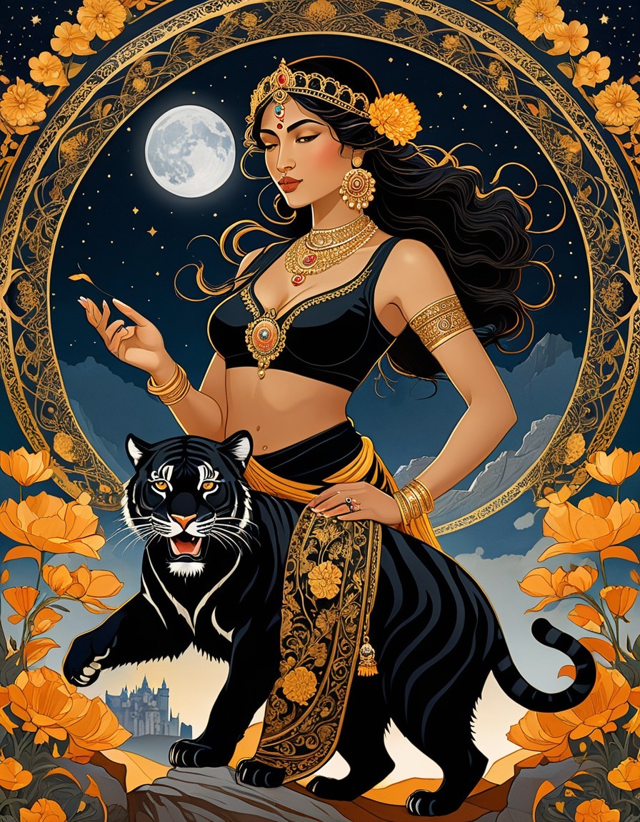 An illustration of a woman with traditional Indian attire and jewelry, accompanied by a tiger, set against a celestial background with a full moon.