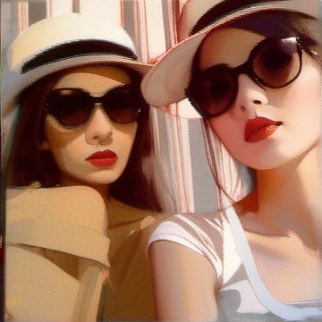 Two stylish women with red lipstick and sunglasses wearing hats, portrayed in a painting with a red and white background.