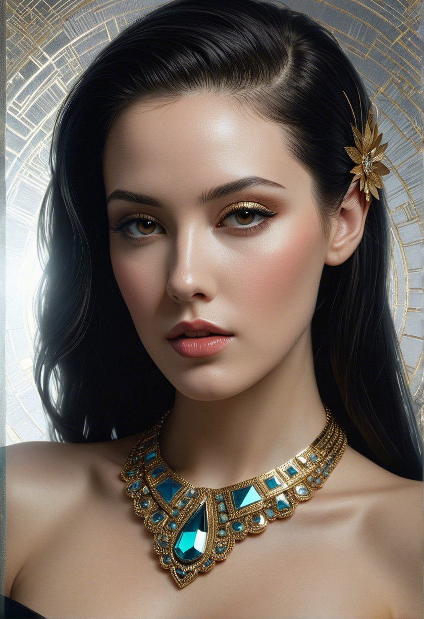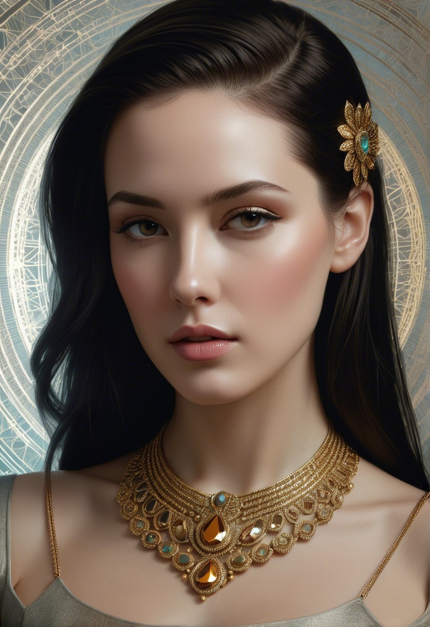 Portrait by Jean-Marc Rochette, line-art and orphism fusion by Man Ray, sfumato, dappled lighting from top, intricate digital portrait, line art, geometrical patterns, asymmetrical composition, hues by Jean-Marc Rochette & Tom Bagshaw & Ed Binkley, metallic colors, illuminated by warm golden light in gradient inking colors, tall and lean details, divisionism, luminism. emulsion lifts, blurred background, gradient inking colors, sfumato-effect, nuanced painterly, transitioning from subtle light to a mesmerizing blend of cerulean blue and soft-gold and silvery-grey, artistic essence by William Adolphe Bouguereau & Ho Baron, hues by Renny Tait and Hugo Pratt, lighting by Ho Baron. Bioluminescent, soft and muted dark background, textured watercolor splashes, vintage, dark fantasy, tonalism, unparalleled detail, paper fibers, soft eroticism, splash ink technique in style of Marc Allante, colorful yam, warm coloring, dark-grey, slight classicism reminiscence, soft rounded edges, (background (Pencil and Pastels, ink and alcohol, abstract micro-pen lines, mathematically inspired fractal patterns, vortexes spiral and cascade) 8:11), mesmerizing complex transparency, holographic, multicolored surreal fantasy, layers of abstract geometry, harmonious blend of crafted intricacies & artistic flair, tints of Vincent DiFate, harmonious blend of styles, movement. Dappled lighting reminiscent of Victor Sheleg affecting color spaces, high contrast, dynamic lighting 1.7, plasticity 1.2, sfumato, stylized face, cel-shaded by Henri de Toulouse-Lautrec, parallax occlusion 1.3, textured layers, painterly, glossy, emulsion shifts, --ar 1:1 --q 2 --s 750, brightened colors, multi-layered eyes, headshot, UHD, HDR, fractal style inspired by Mandelbrot set, Lotte Reiniger's influence, dreamlike warm grey, partially blurred background, subsurface scattering 1.4, dof, debeh, bokeh, unique visual appeal. Capture the essence of a pin-up poster with glossy synthetic textures juxtaposed with delicate skin, intricate shadows, and an evolving form. Explore subtle luminism and an extreme variety of colors, slightly sculpted features, and an illusion of flowing hair. Enhance the image with subsurface scattering and raytraced shadows for a captivating finish.