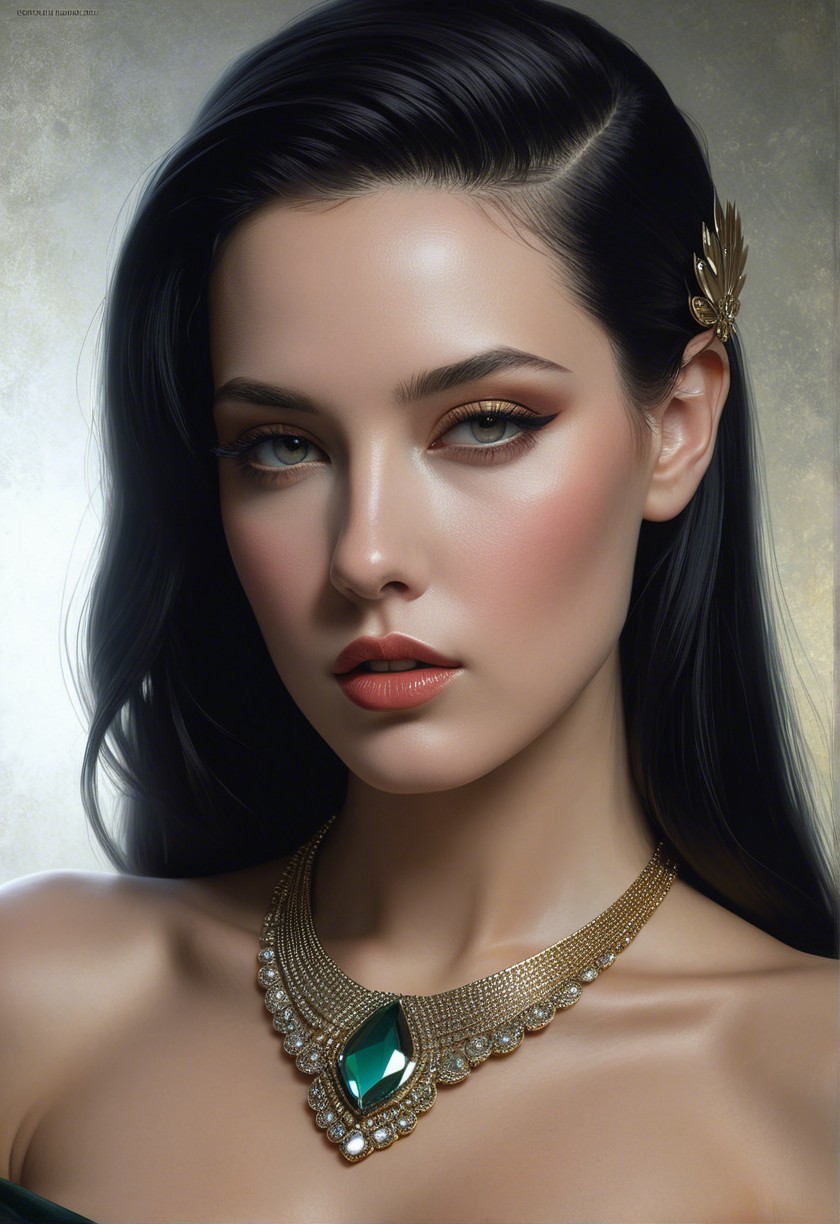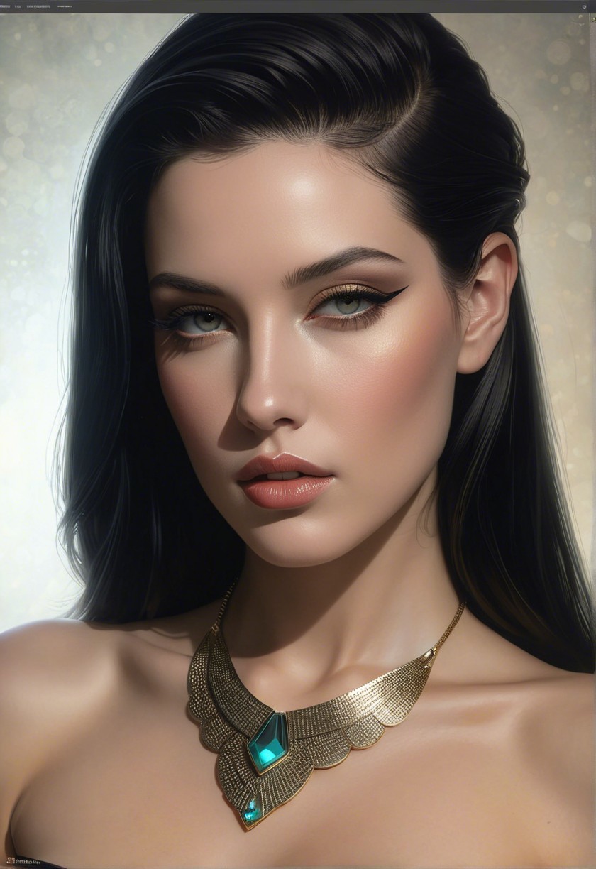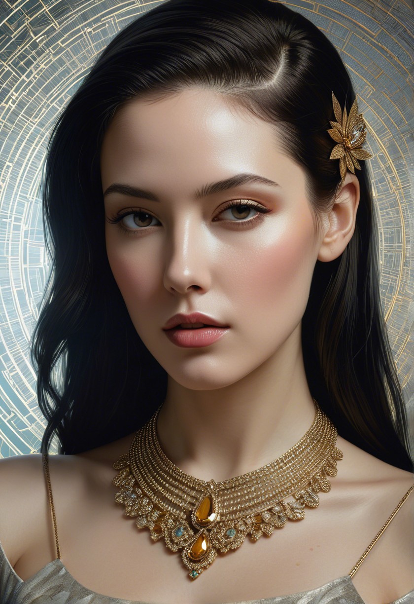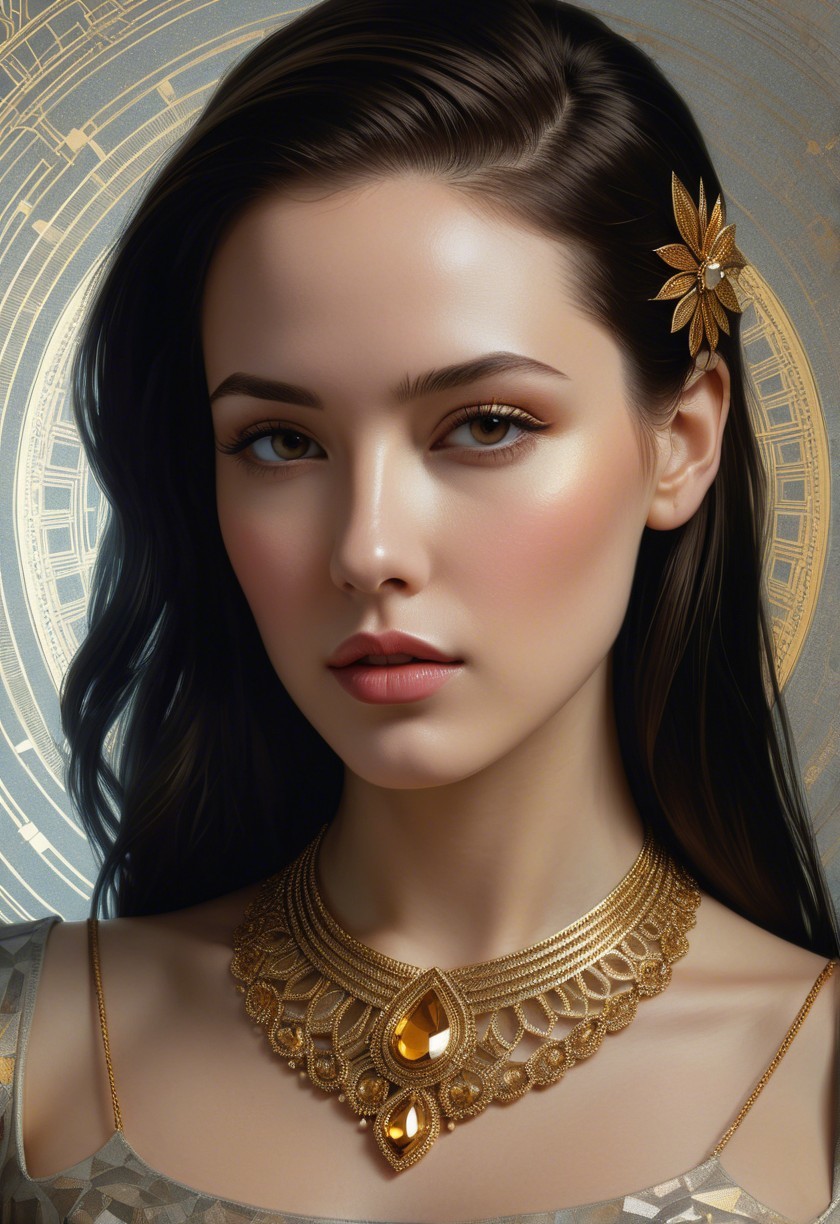 Prompt: Portrait by Jean-Marc Rochette, line-art and orphism fusion by Man Ray, sfumato, dappled lighting from top, intricate digital portrait, line art, geometrical patterns, asymmetrical composition, hues by Jean-Marc Rochette & Tom Bagshaw & Ed Binkley, metallic colors, illuminated by warm golden light in gradient inking colors, tall and lean details, divisionism, luminism. emulsion lifts, blurred background, gradient inking colors, sfumato-effect, nuanced painterly, transitioning from subtle light to a mesmerizing blend of cerulean blue and soft-gold and silvery-grey, artistic essence by William Adolphe Bouguereau & Ho Baron, hues by Renny Tait and Hugo Pratt, lighting by Ho Baron. Bioluminescent, soft and muted dark background, textured watercolor splashes, vintage, dark fantasy, tonalism, unparalleled detail, paper fibers, soft eroticism, splash ink technique in style of Marc Allante, colorful yam, warm coloring, dark-grey, slight classicism reminiscence, soft rounded edges, (background (Pencil and Pastels, ink and alcohol, abstract micro-pen lines, mathematically inspired fractal patterns, vortexes spiral and cascade) 8:11), mesmerizing complex transparency, holographic, multicolored surreal fantasy, layers of abstract geometry, harmonious blend of crafted intricacies & artistic flair, tints of Vincent DiFate, harmonious blend of styles, movement. Dappled lighting reminiscent of Victor Sheleg affecting color spaces, high contrast, dynamic lighting 1.7, plasticity 1.2, sfumato, stylized face, cel-shaded by Henri de Toulouse-Lautrec, parallax occlusion 1.3, textured layers, painterly, glossy, emulsion shifts, --ar 1:1 --q 2 --s 750, brightened colors, multi-layered eyes, headshot, UHD, HDR, fractal style inspired by Mandelbrot set, Lotte Reiniger's influence, dreamlike warm grey, partially blurred background, subsurface scattering 1.4, dof, debeh, bokeh, unique visual appeal. Capture the essence of a pin-up poster with glossy synthetic textures juxtaposed with delicate skin, intricate shadows, and an evolving form. Explore subtle luminism and an extreme variety of colors, slightly sculpted features, and an illusion of flowing hair. Enhance the image with subsurface scattering and raytraced shadows for a captivating finish.