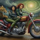 Two women ride a vibrant motorcycle, showcasing fierce expressions. A large, stylized tiger sits behind them, with swirling clouds and a castle in the background, creating a dynamic, adventurous scene.