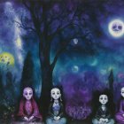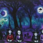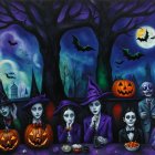 The eerie scene features spooky characters, including a skeletal figure and children with expressive makeup, surrounded by carved pumpkins against a dark, twilight backdrop with bats and a moon.