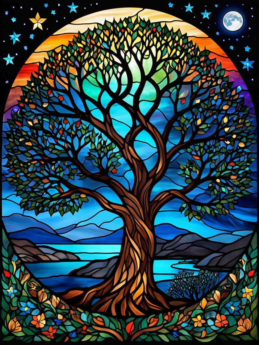 A vibrant stained glass artwork depicts a majestic tree with colorful leaves, surrounded by a serene landscape of water and hills beneath a starry night sky and glowing moon.