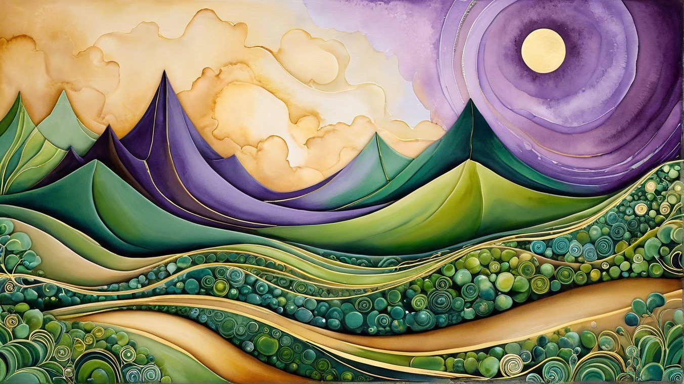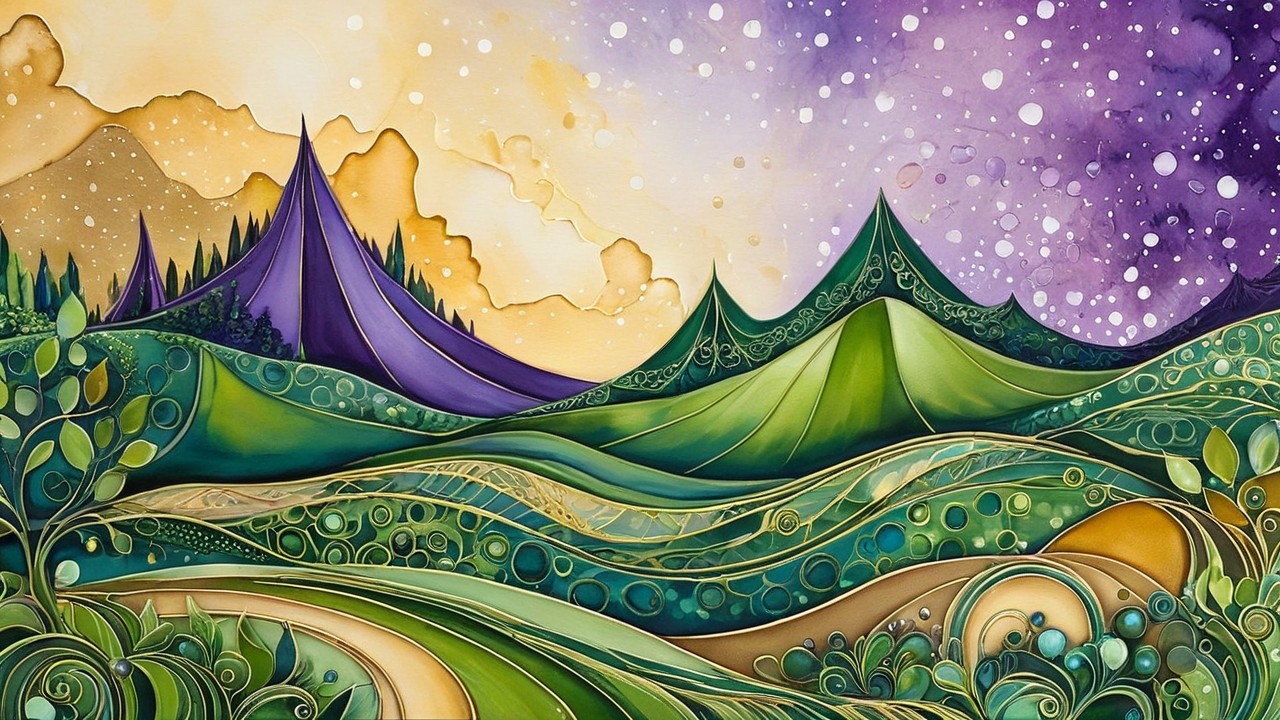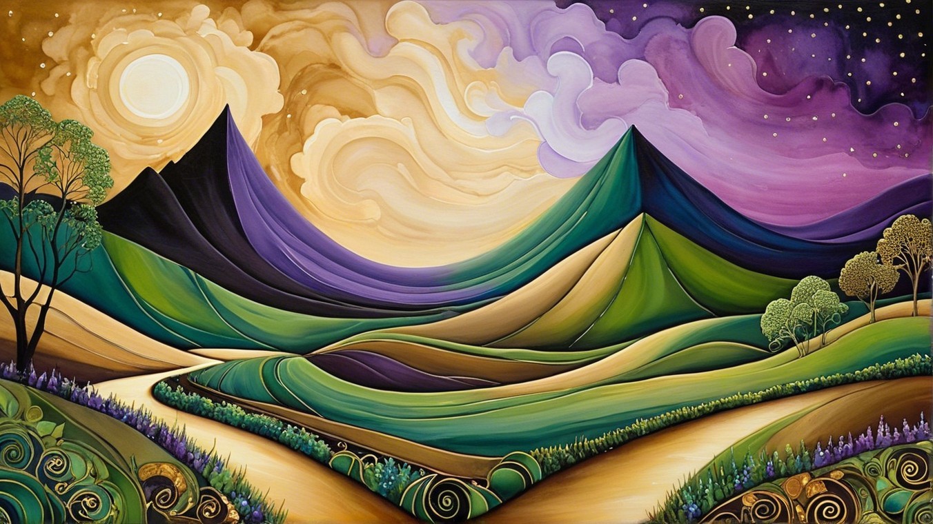 A vivid landscape features stylized mountains in purple and green hues, rolling hills, and whimsical trees adorned with flowers, all under a sky transitioning from day to night.