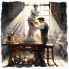 A sculptor works intently on a dark, elegant statue in a sunlit studio. Tools and materials are scattered on the wooden table, while light streams through large windows, highlighting the art.