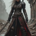 A fierce figure stands in a dramatic, ruined landscape, clad in a striking leather outfit with metallic accents. Holding a glowing sword, the character exudes power and confidence.