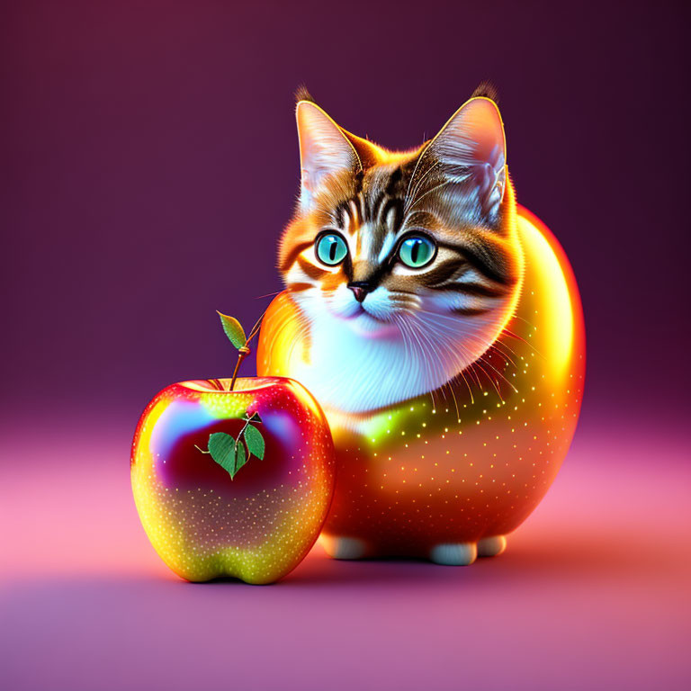 Colorful Cat Illustration with Apple-Like Body on Purple Background