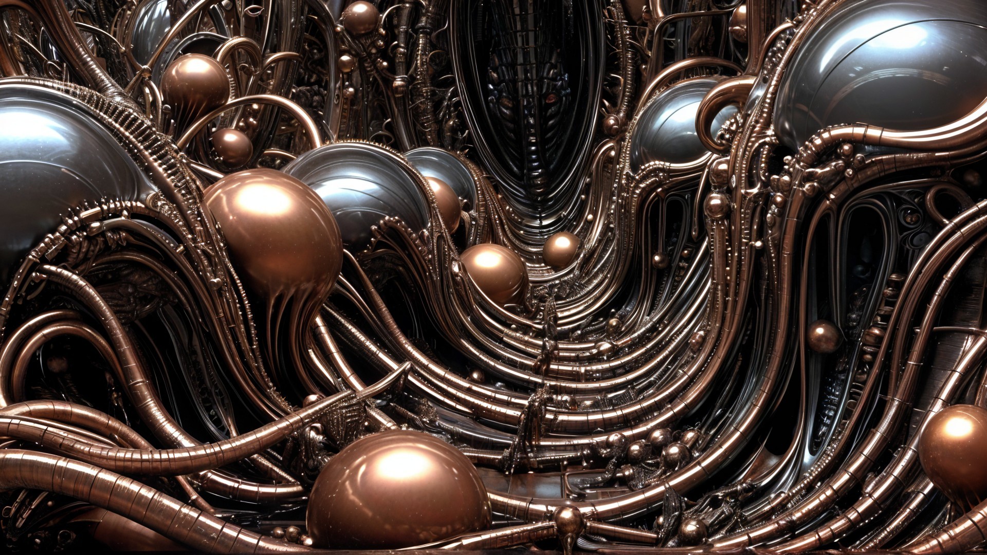 The image showcases an intricate, surreal landscape of metallic structures resembling organic forms, intertwining with smooth curves and spheres, set against a dramatic sky.
