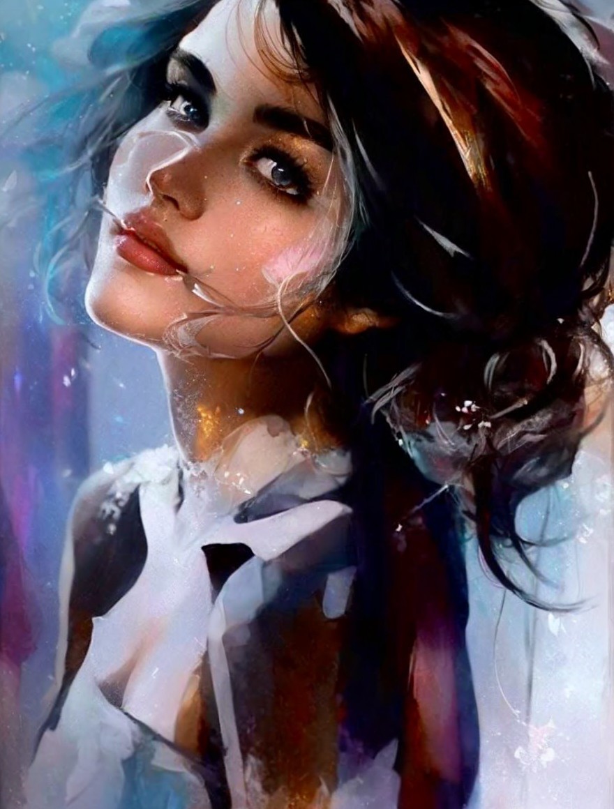 A beautifully painted portrait of a young woman with long, dark hair, soft features, and sparkling eyes. The background features fluid colors, enhancing her serene expression and captivating presence.