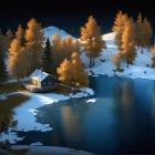A tranquil winter scene featuring a cozy cabin beside a calm, reflective lake. Snow-covered mountains tower in the background under a moonlit sky, creating a serene and peaceful atmosphere.