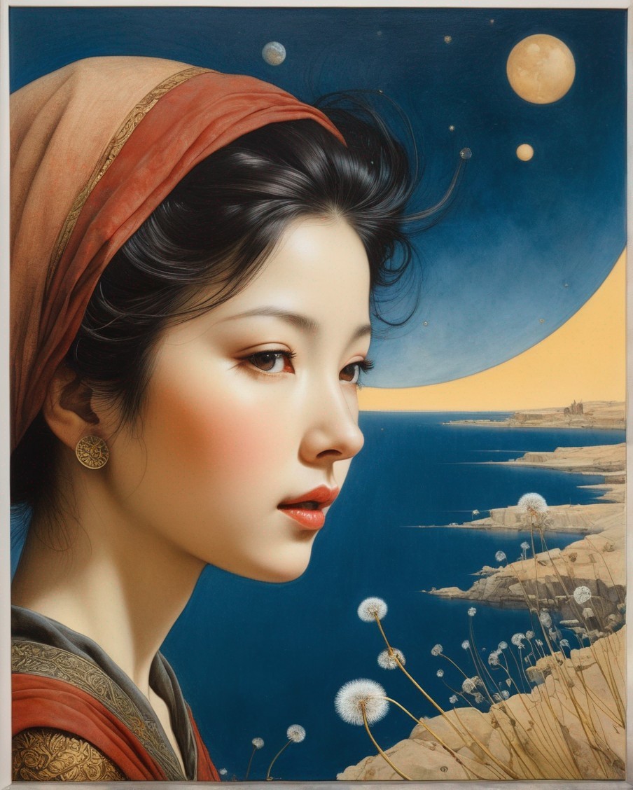 A painting of a woman with dandelions overlooking a calm sea, rendered with fine details and a surreal, serene quality.