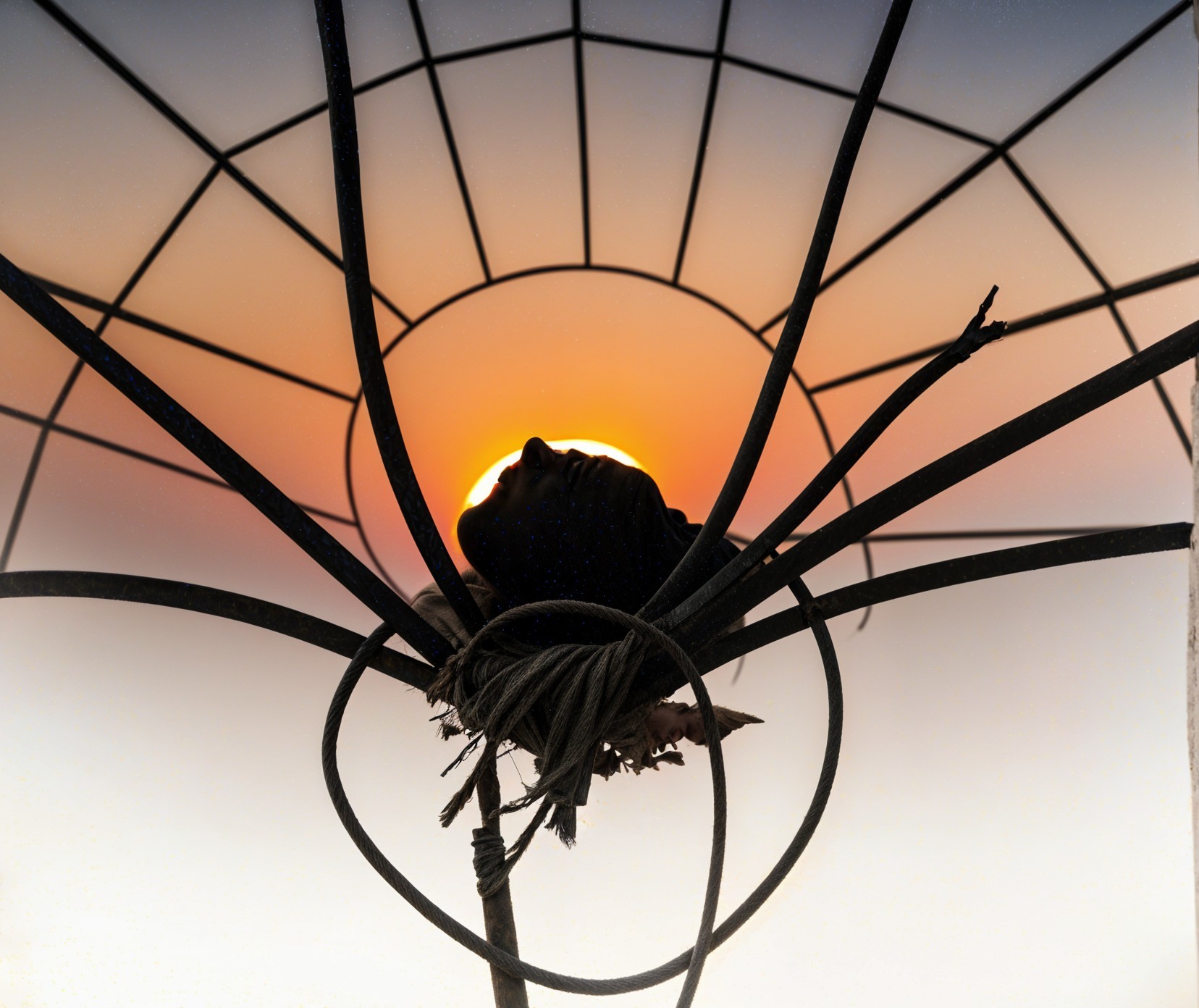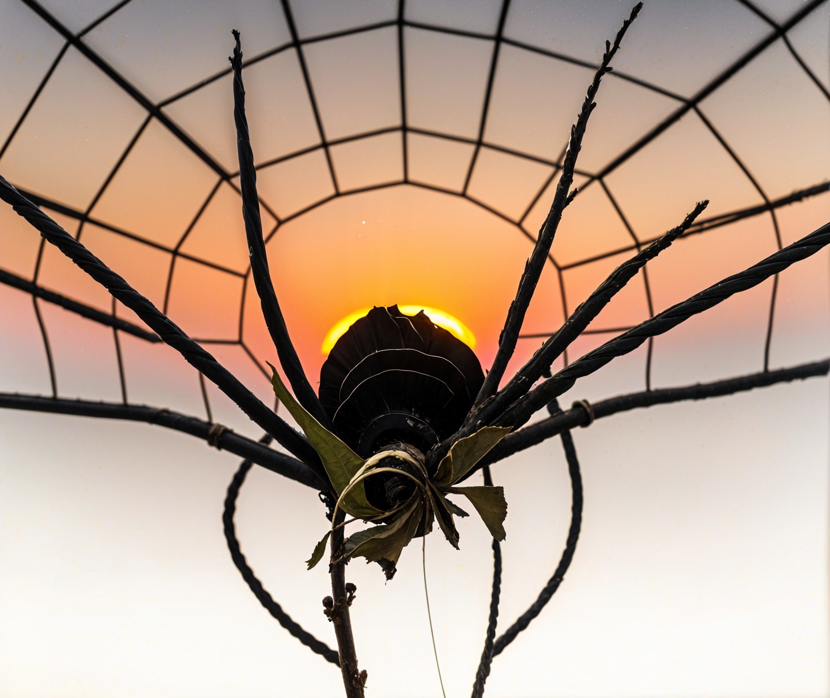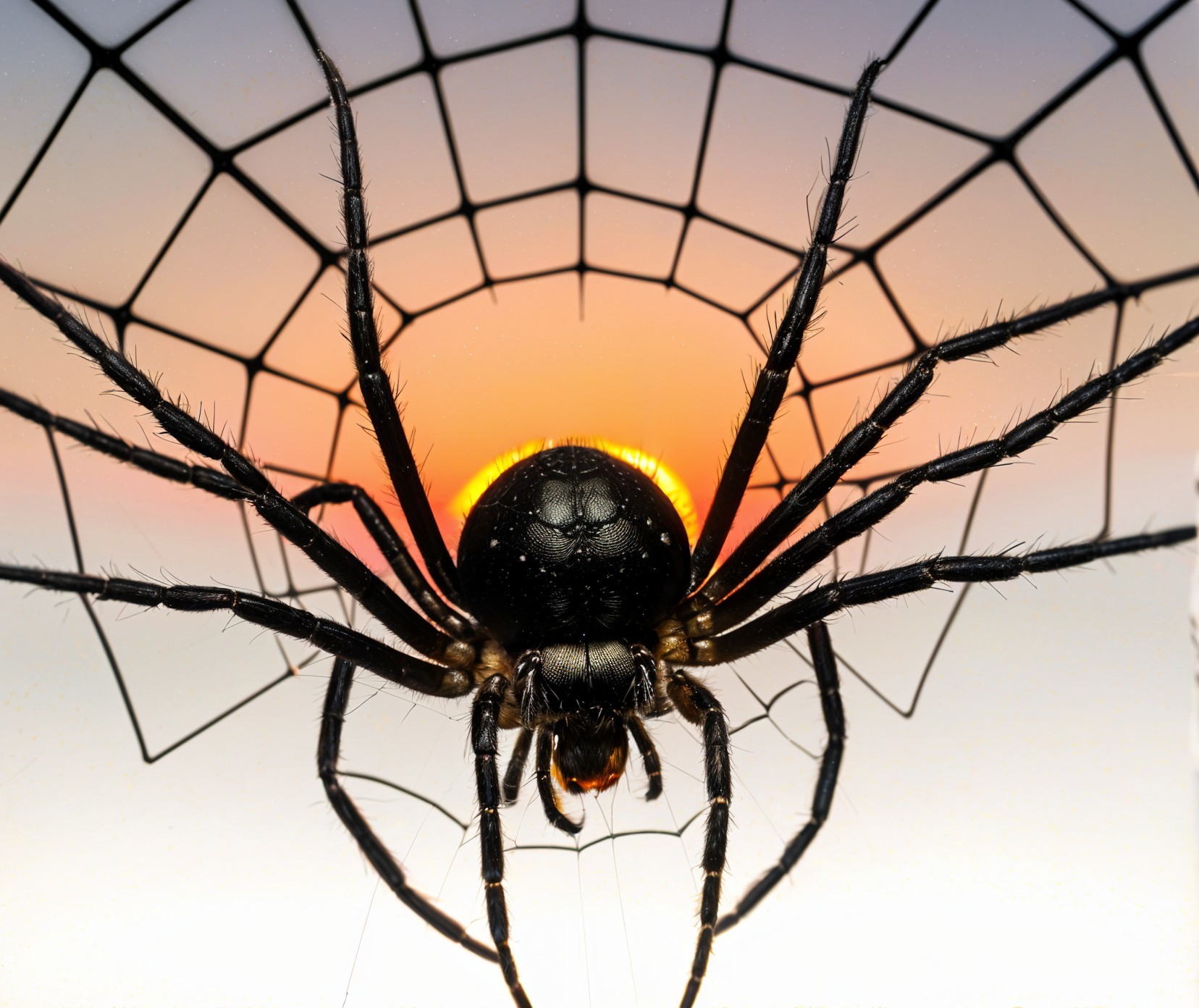 Create an illustration of a single black rose with deep red petals, standing prominently against a glowing yellow light source that resembles the sun. The rose is positioned at the center of the image, with delicate green leaves attached to its stem. Surrounding the rose, intricate spider web patterns create a mesmerizing backdrop, emphasizing the contrast between the dark rose and the bright background. The entire scene exudes a mysterious yet beautiful ambiance, with a warm, golden glow radiating from the light source, enhancing the dramatic effect of the composition. The focus should be on the rose, highlighting its elegance and uniqueness in the surreal environment.