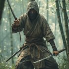 A ninja stands in a bamboo forest, dressed in a black outfit with a hood and face mask. He holds a sword, poised for action, surrounded by tall, green bamboo stalks. The atmosphere is intense and mysterious.