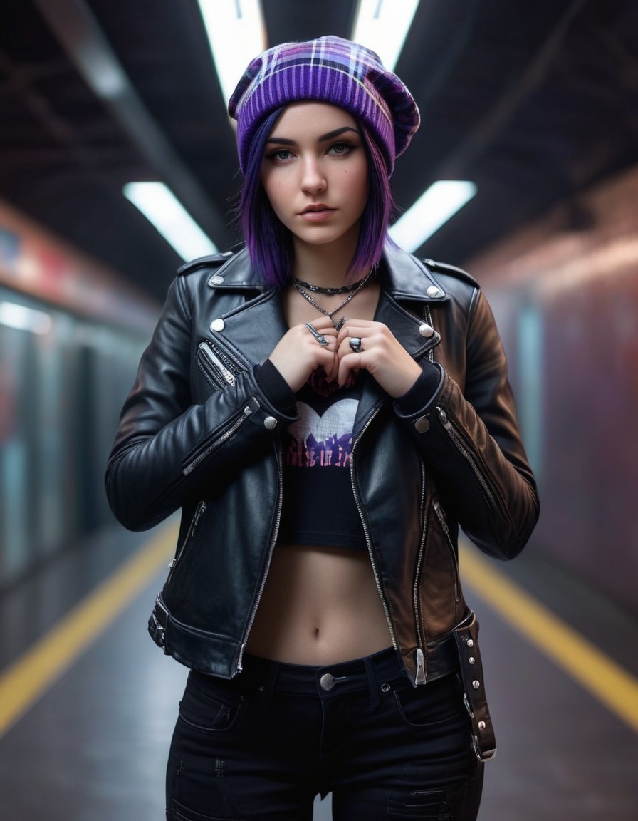 (Auto-Prompt from "Purple Heart: Subway Style" AI Up) - A woman with purple hair and a beanie, wearing a leather jacket and layered necklaces, stands in a subway station.