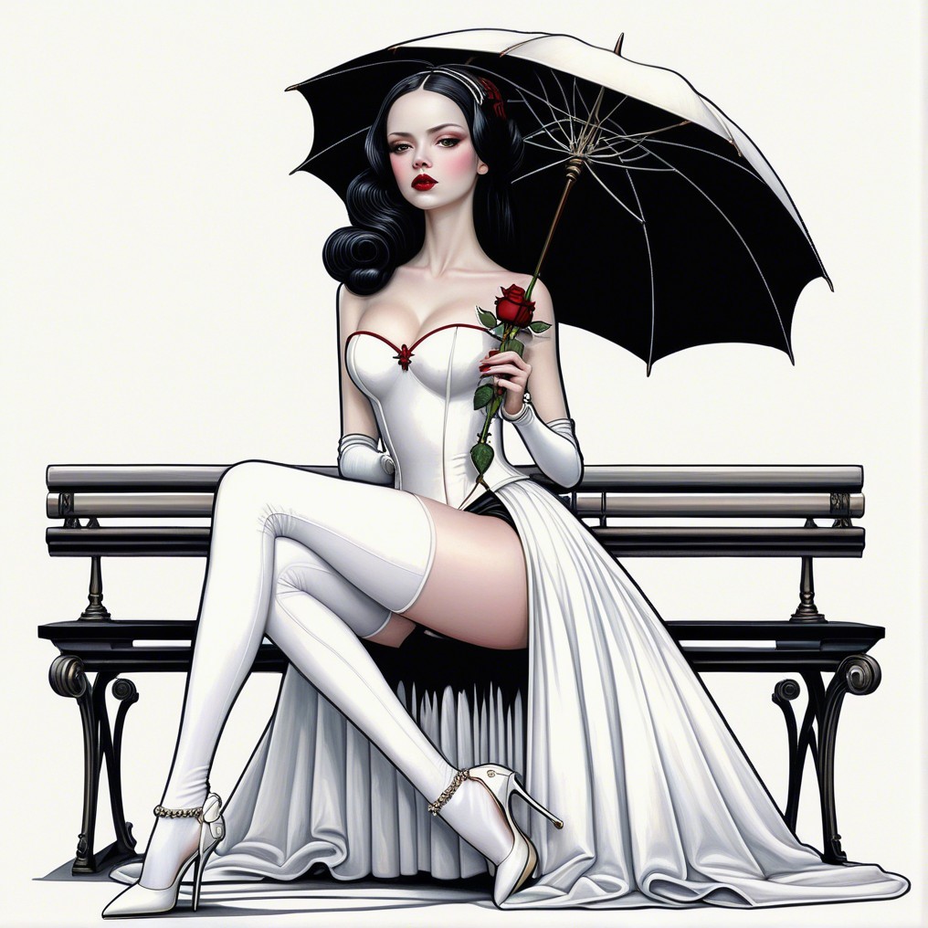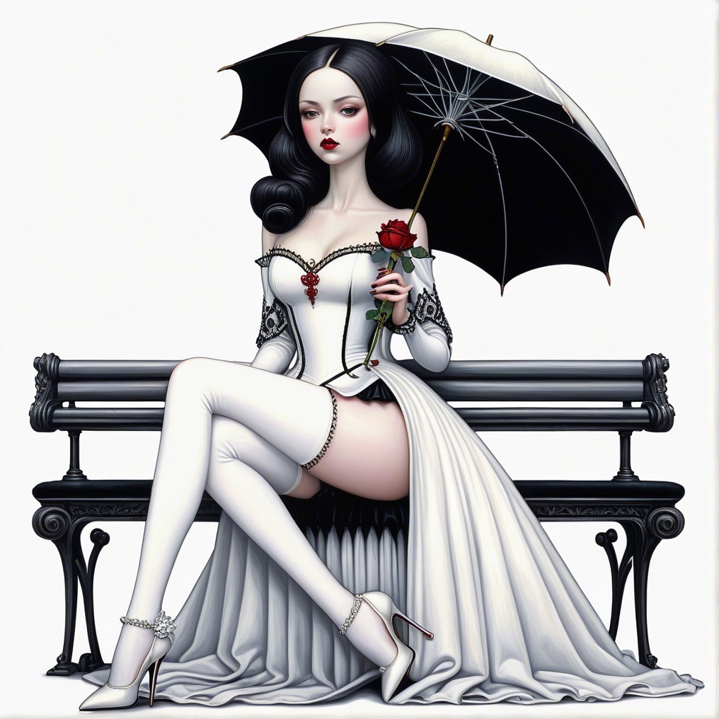 A gothic figure sits elegantly on a bench, dressed in a white corset and flowing skirt. She holds a rose and an umbrella, with striking black hair and an air of mysterious allure.