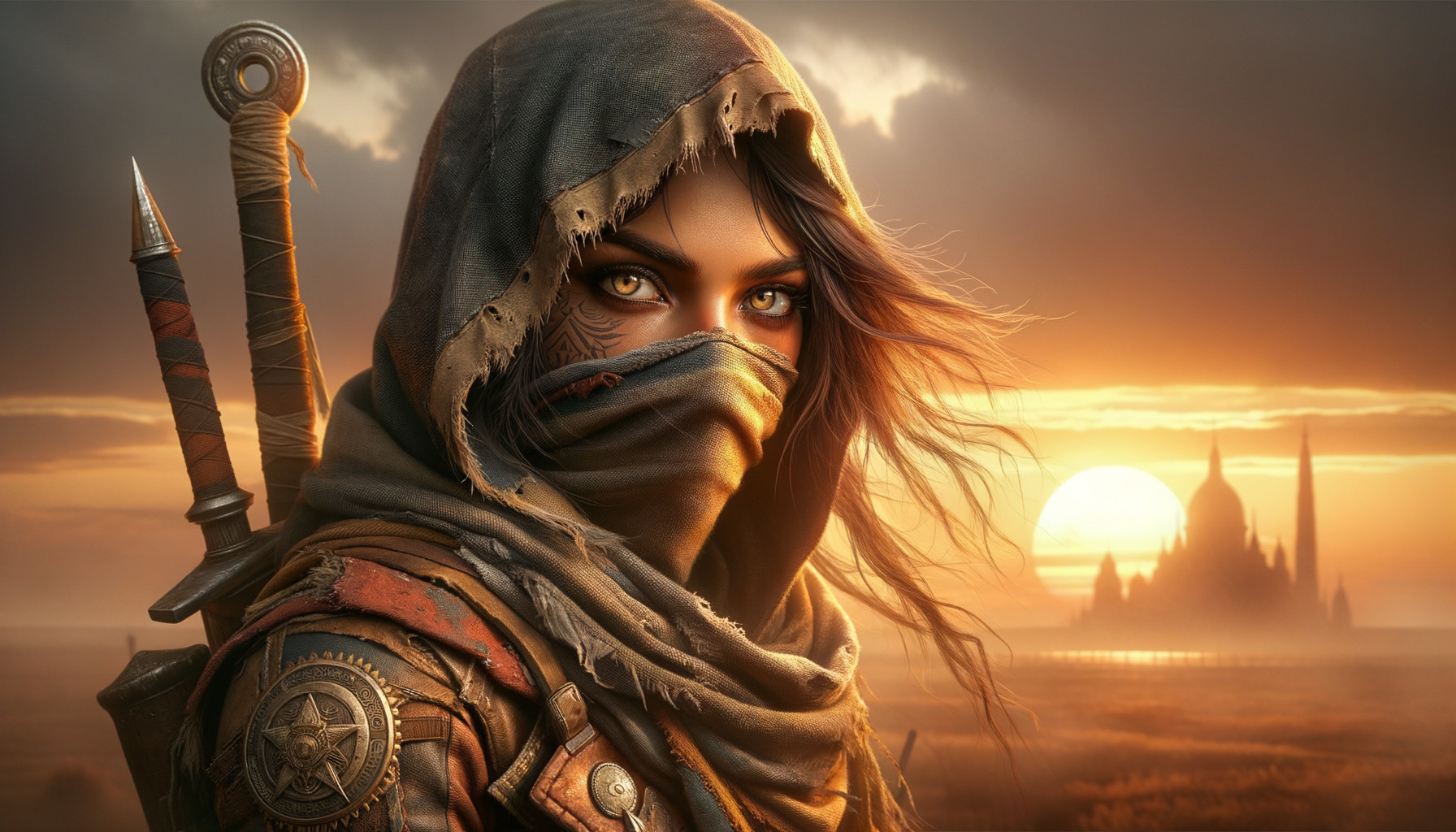 Digital painting, resilient young woman assasin wanderer, intense eyes, determination, tattered scarf, head, mouth, nose coverage, leather outfit, assasins emblem, patchwork materials, loose hair strands, wind, makeshift sword, dusty, orange-tinted sky, sunset, cathedral, horizon, hope, defiance, high detail, 16:9 aspect ratio, emotive expression, sunset ambiance, fantasy landscape, determination, resourcefulness, intense hopeful gaze, face tattoos, realistic skin texture, skin pores