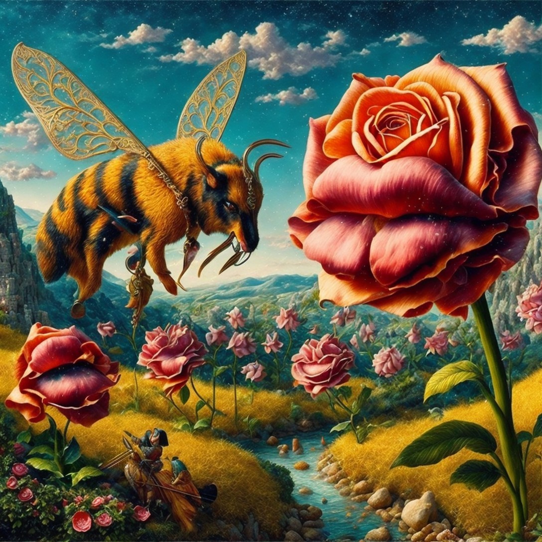 Surreal painting: oversized bee, vibrant roses, tiny castles, river