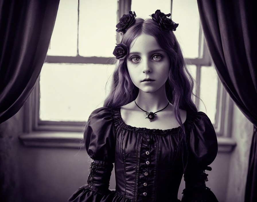 A gothic-styled young woman with dark attire and rose accessories stares pensively by a window.