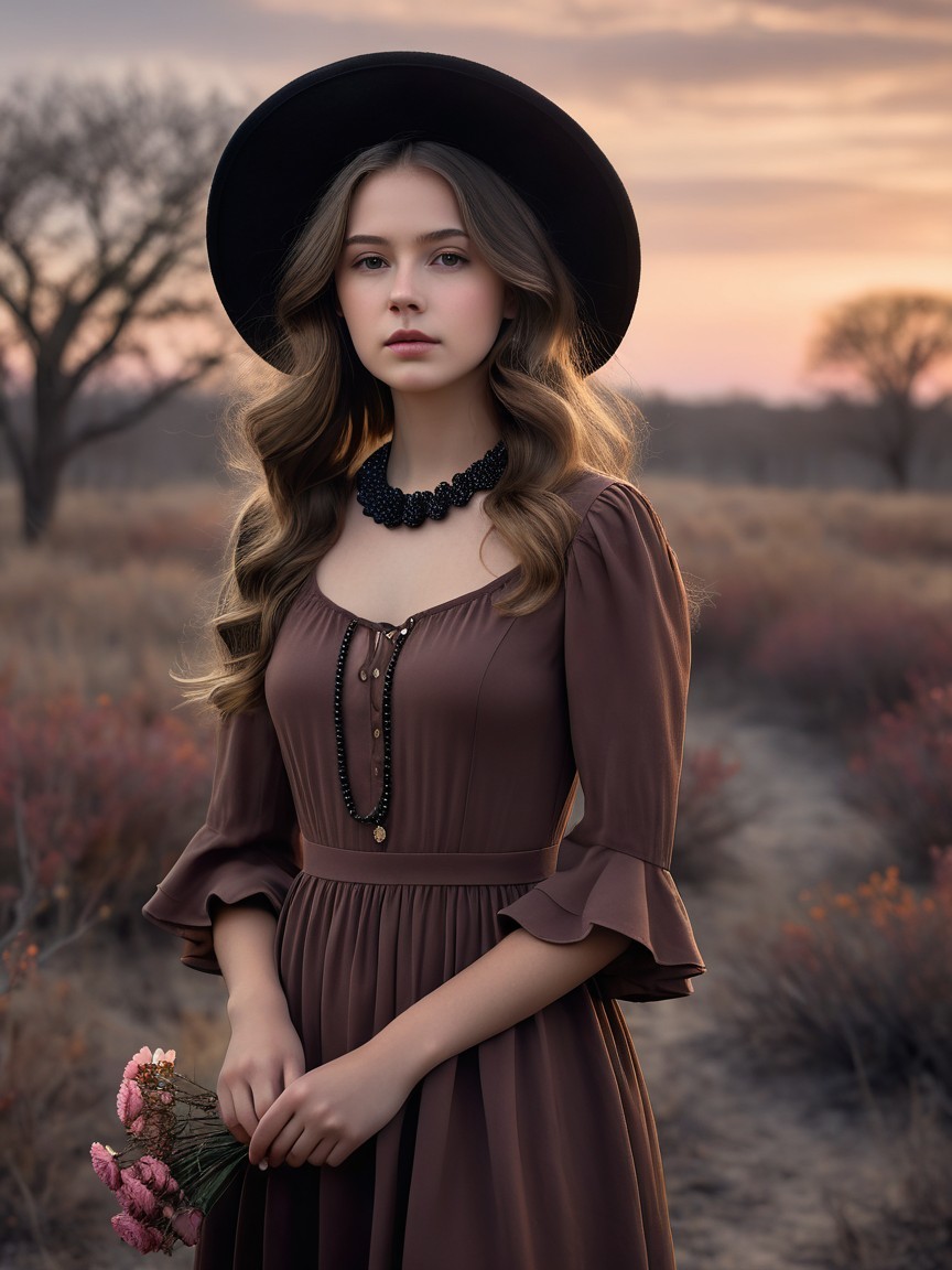 A young woman stands in a field at sunset, wearing a brown dress with ruffled sleeves and a wide-brimmed black hat. She holds pink flowers and gazes thoughtfully into the distance.