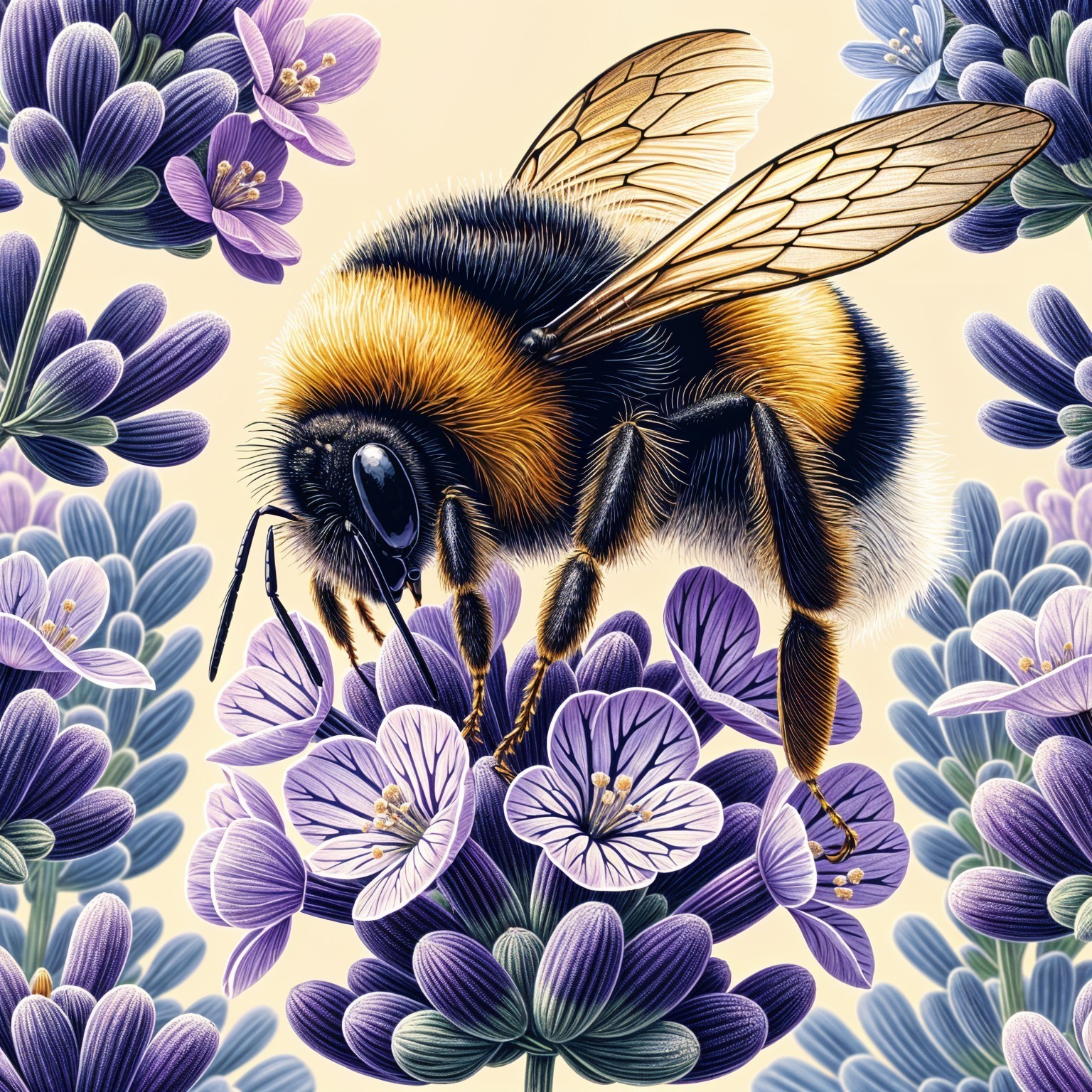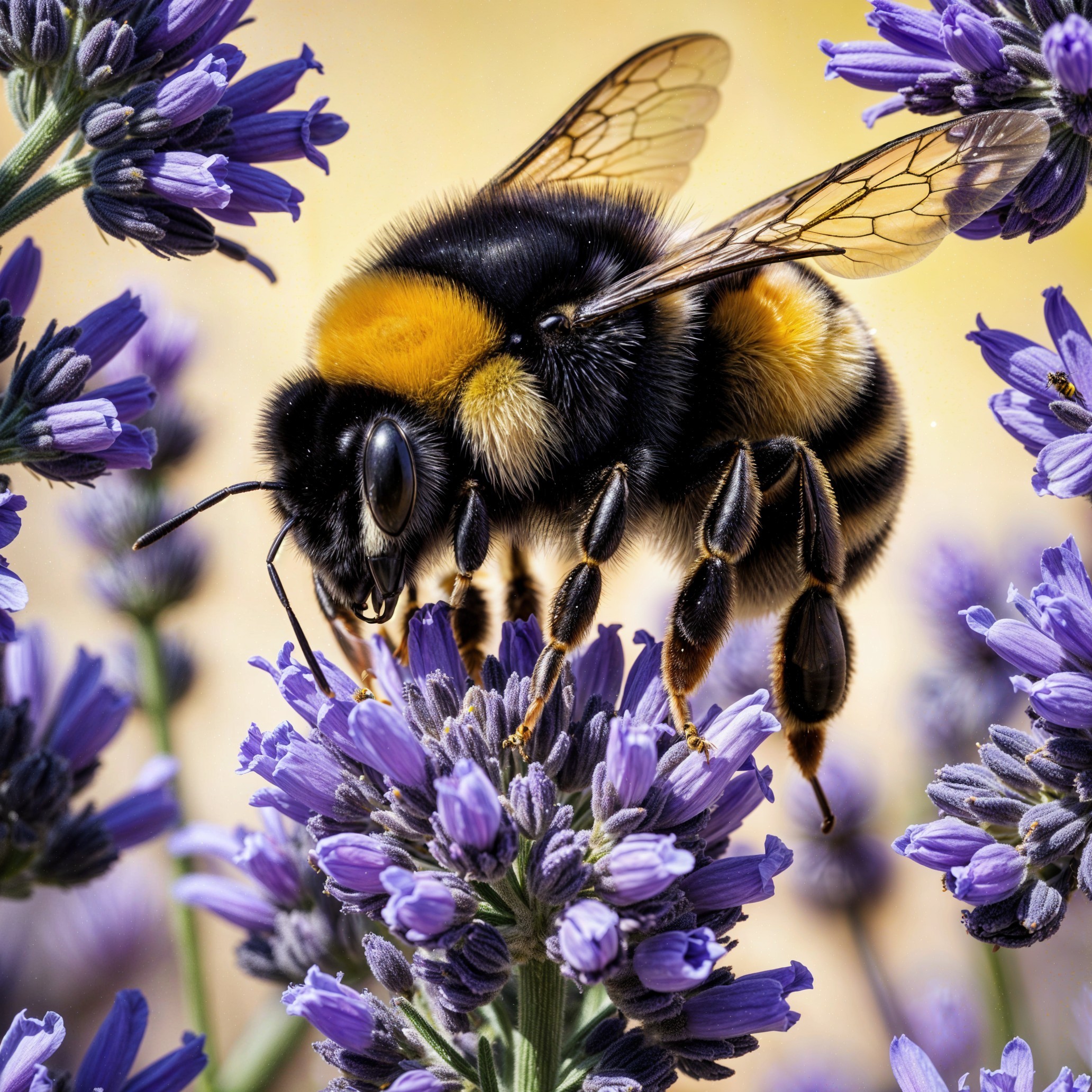 A close-up of a bumblebee perched on vibrant purple lavender flowers, showcasing its intricate details and soft fur against a blurred golden background. Nature's beauty in full display!